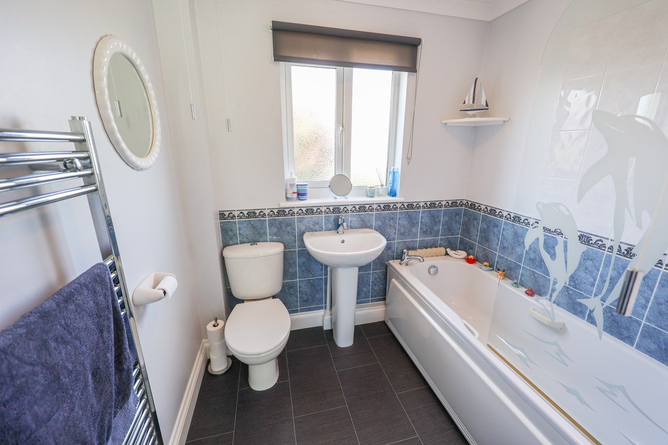 6' 5" x 5' 8" (1.96m x 1.73m) With towel radiator, window to the side, extractor fan, panelled bath with mixer tap and an electric shower over, fully tiled bath area, low level W.c., wash hand basin.