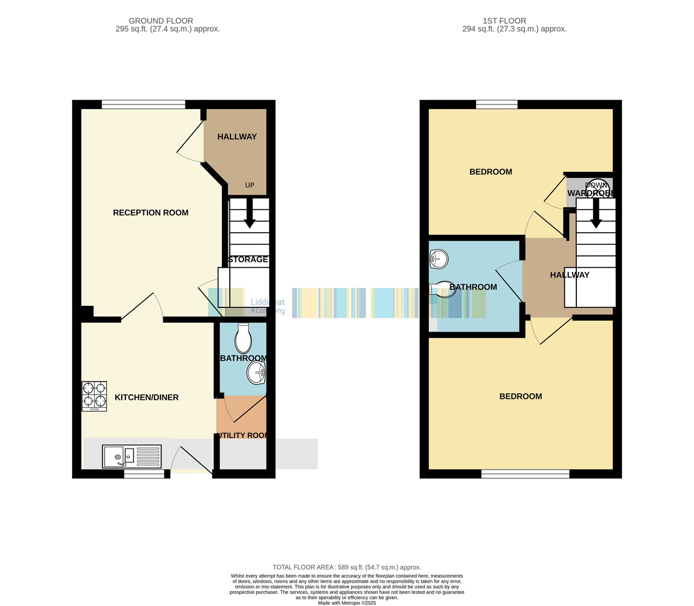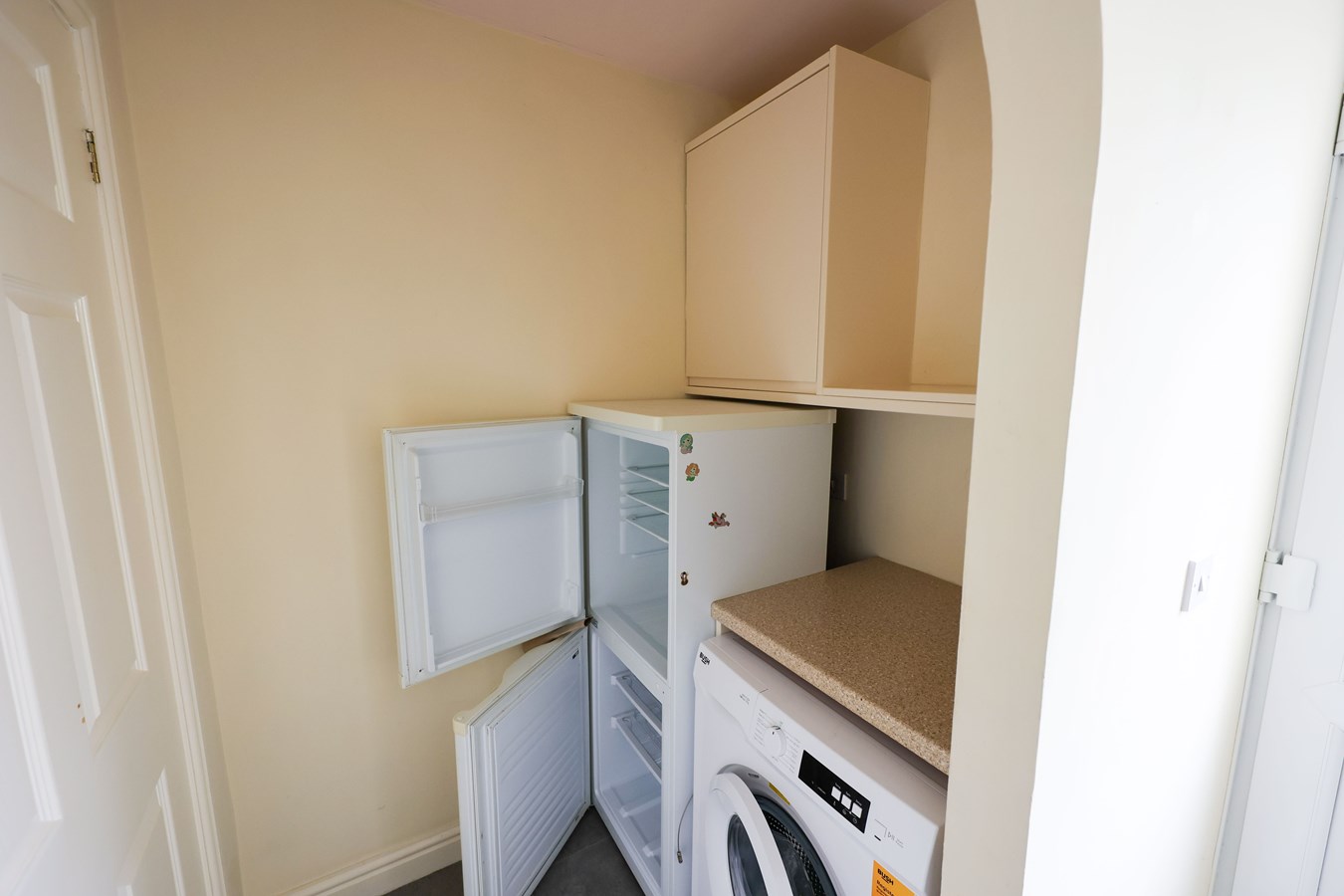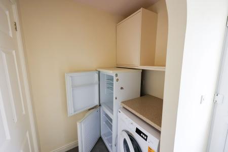 1.27m x 1.61m (4' 2" x 5' 3") fitted with worktop space and plumbing below for washing machine and space on the work top for a tumble dryer. High level cupboard.