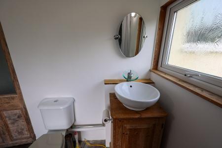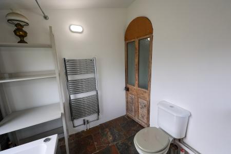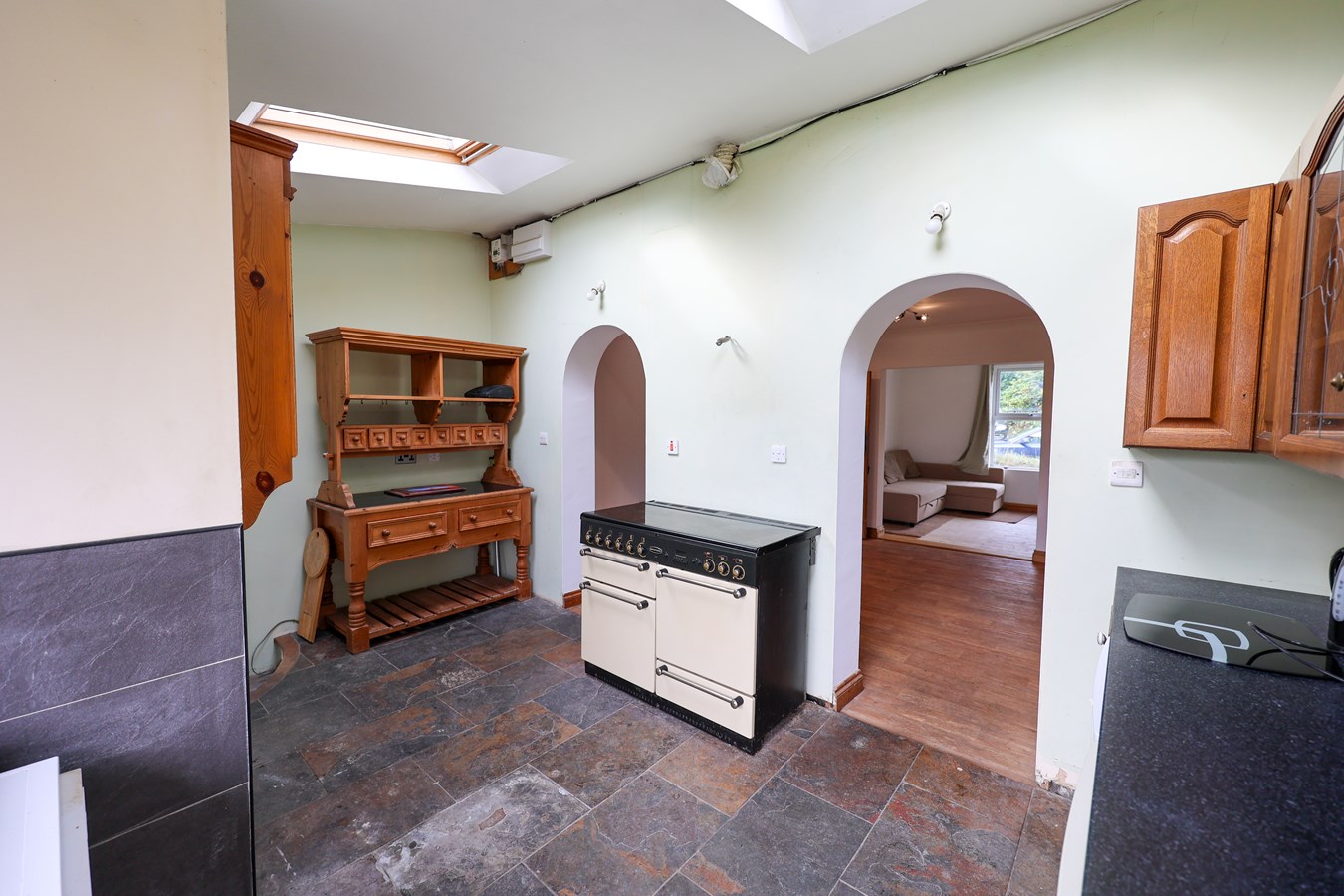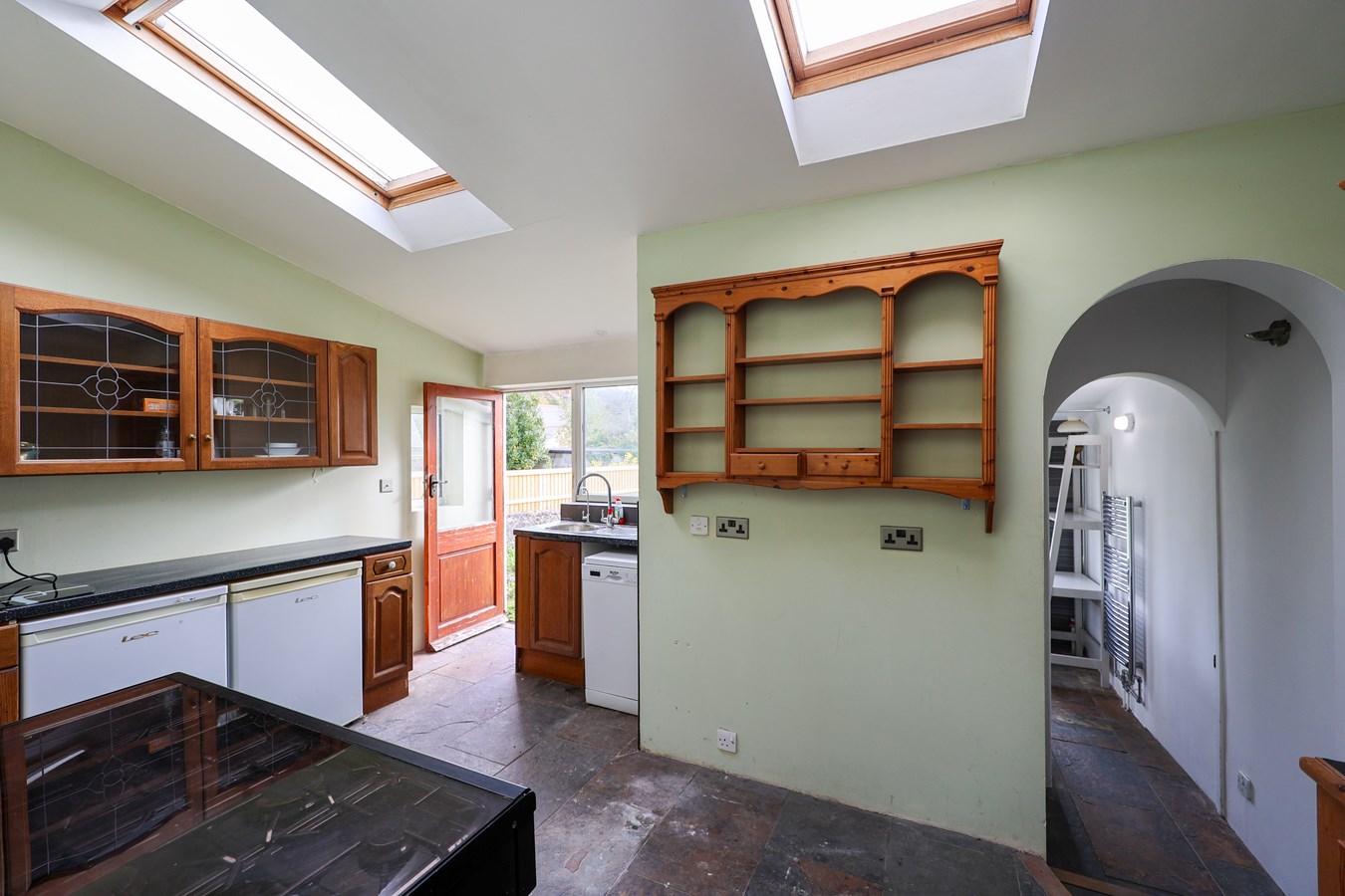 10' 0" x 15' 4" (3.05m x 4.67m) With a natural slate floor, fitted with wood fronted units, with sink unit, space for cooker and fridge, space and plumbing for washing machine, RCD electric unit, two Velux skylights, window to the rear and side, half glazed double glazed door leading to the rear garden, natural slate floor, step leading down to the utility area.