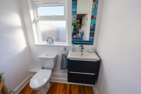 1.77m x 1.17m (5'9" x 3'10") Upvc double glazed window to rear. A White suite comprising, low level WC and hand wash basin. Wood effect vinyl flooring. Tiled walls.