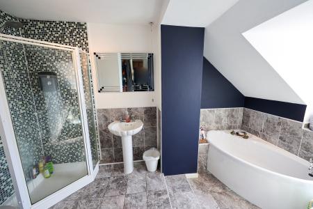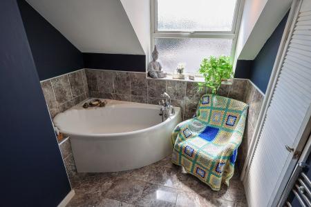 3.84m x 2.15m (12' 7" x 7' 1") The bathroom is well-appointed with a ceramic tiled floor and side window for natural light. It features a corner bath with shower mixer attachment, a separate corner shower cubicle with electric shower, low-level WC, wash hand basin, and a towel radiator. Half-tiled walls add a practical finish, while a louvered door opens to a handy airing cupboard.