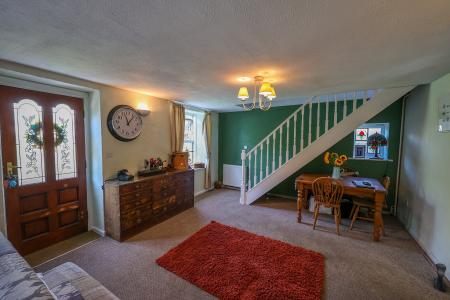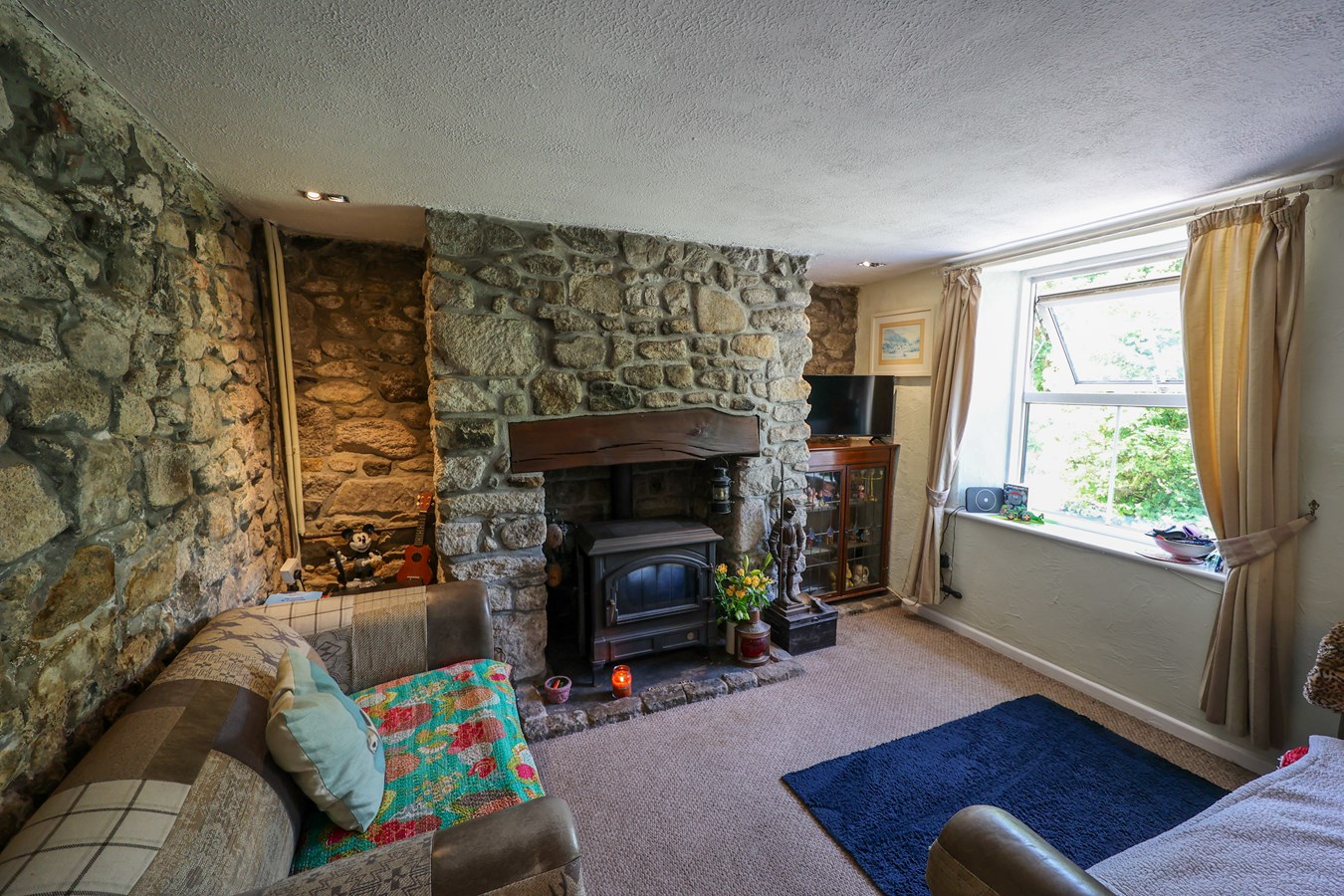 4.0m x 7.85m (13' 1" x 25' 9") Brimming with character, the main living room features twin UPVC double-glazed front windows and a charming stained-glass side window, creating a bright and welcoming space. A striking floor-to-ceiling granite fireplace with timber lintel and slate hearth provides a dramatic focal point, housing a wood-burner-style oil-fired boiler that supplies both the heating and hot water. Four wall lights add ambience, while a small-paned door leads into the kitchen. Stairs rise to the first floor.