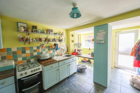 3.0m x 4.9m (9' 10" x 16' 1") The kitchen features a ceramic tiled floor and a practical layout with a one and a half bowl sink unit with mixer tap, space for a cooker, and a fitted (currently unconnected) Aga. A range of base units and high-level cupboards provide ample storage, complemented by a small breakfast bar for casual dining. A side lobby area gives access to the parking driveway via a glazed door, as well as internal access to the double garage.