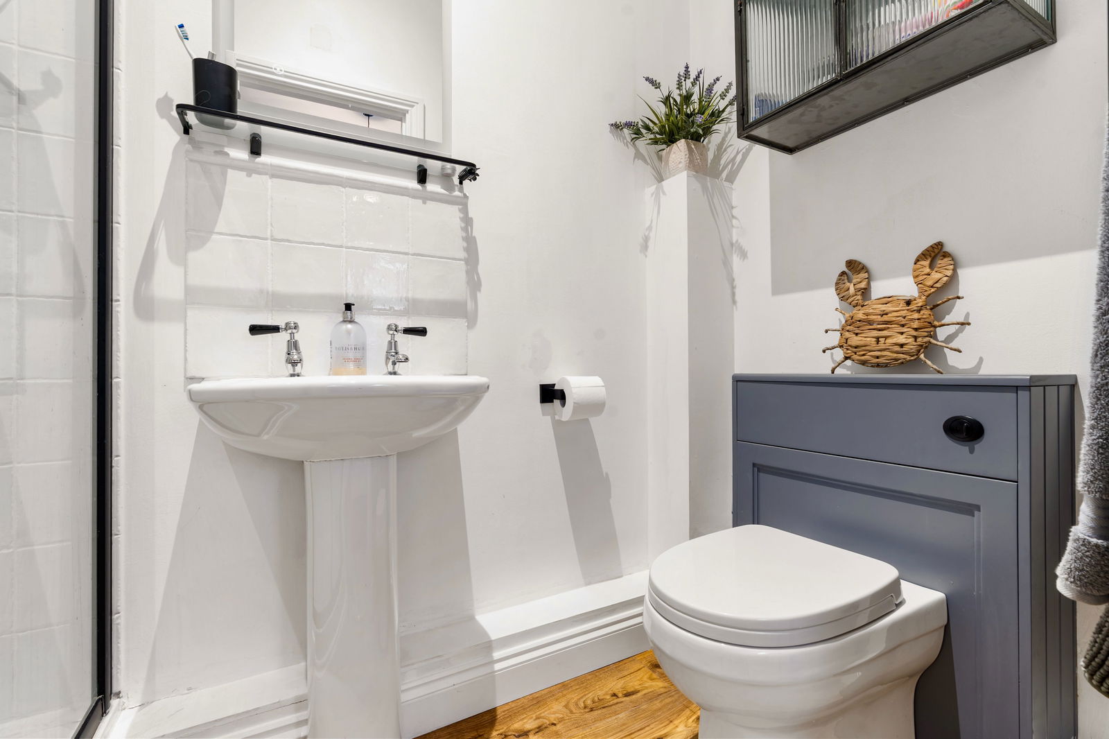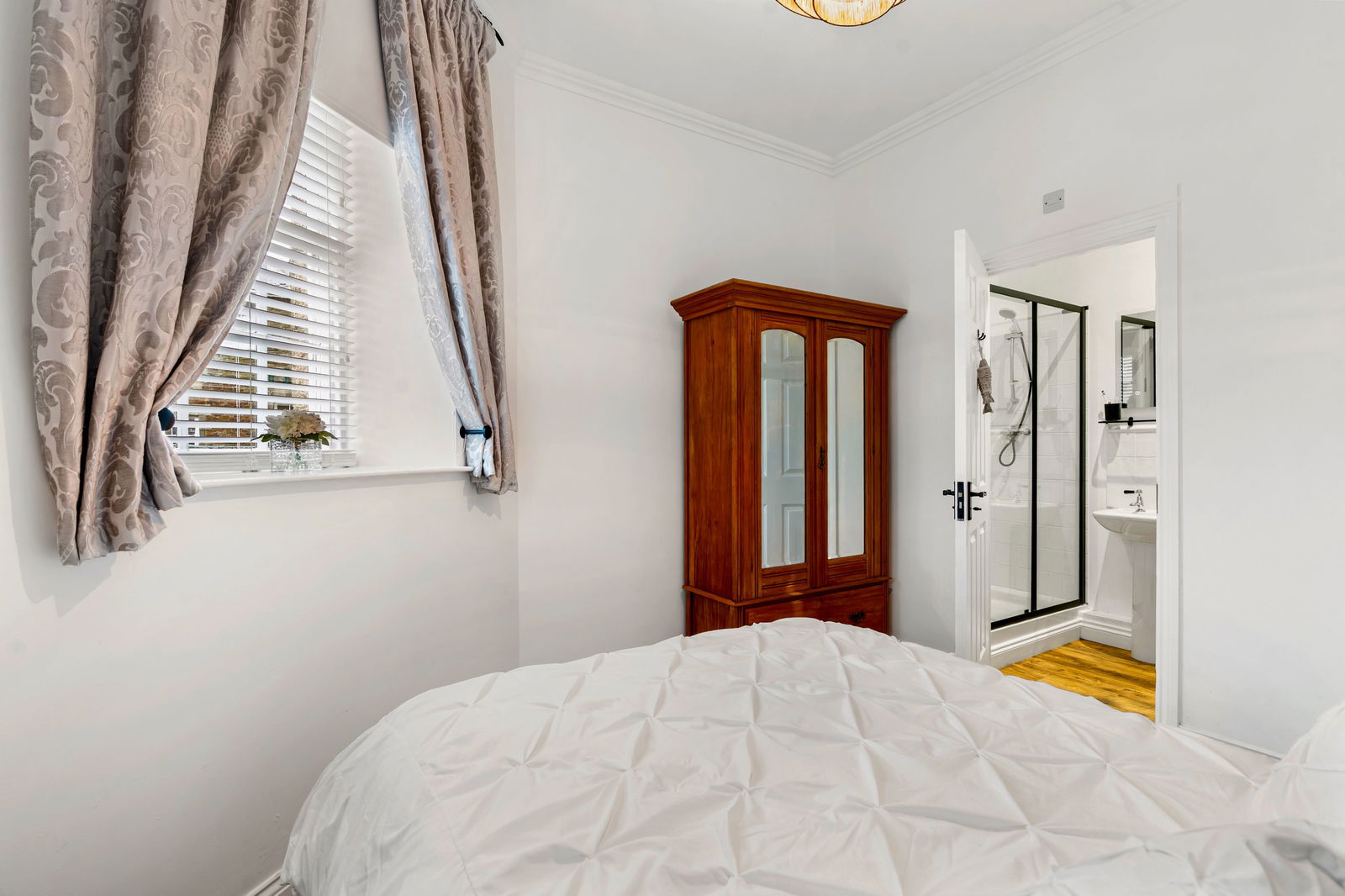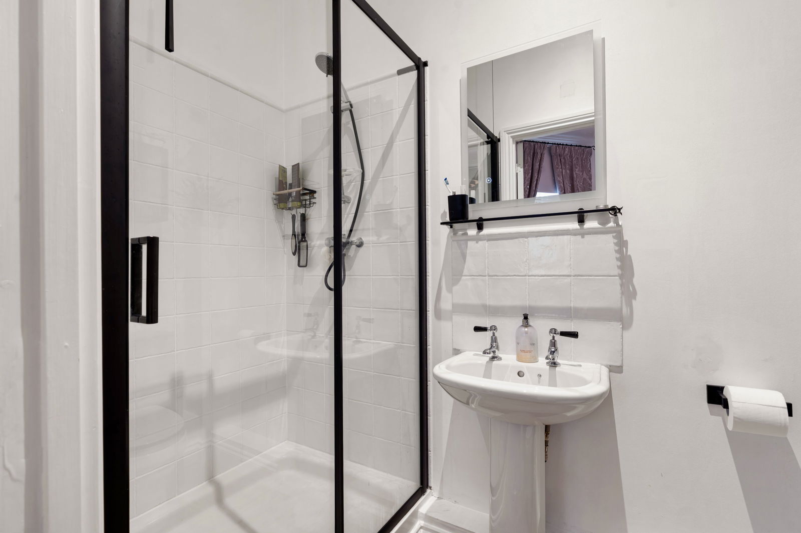Double shower, pedestal wash hand basin, low flush WC, heated towel rail, electric de-mist mirror and extractor fan.