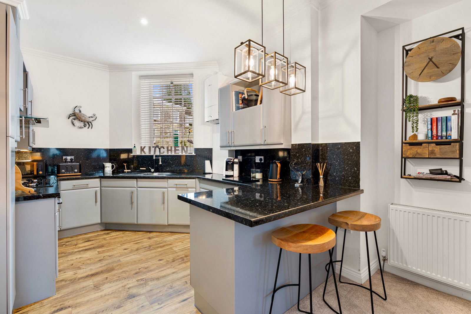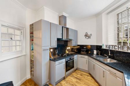 Part divided from the lounge with a peninsular breakfast bar, sash window to rear. The kitchen is fitted with a superb range of modern units comprising base cupboards with worktops over and cupboards above, stainless steel sink unit with mixer tap, integral appliances include electric oven, five ring glass gas hob with extractor over, dishwasher, washing machine, fridge and separate freezer. Wall mounted gas combi boiler suppling central heating and hot water, radiator.
