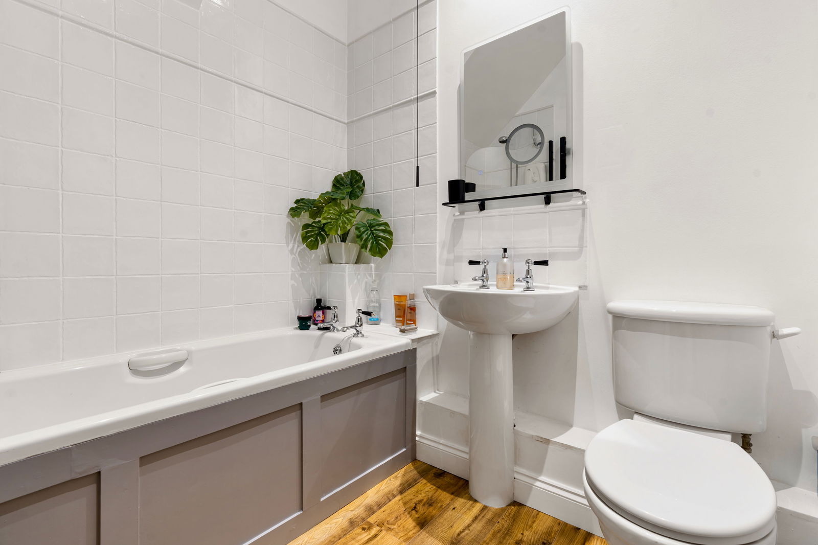 Panelled bath with electric Mira shower and glazed shower screen, pedestal wash hand basin, low flush WC, heated towel rail, electric de-mist mirror with shaver charge point and extractor fan.