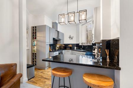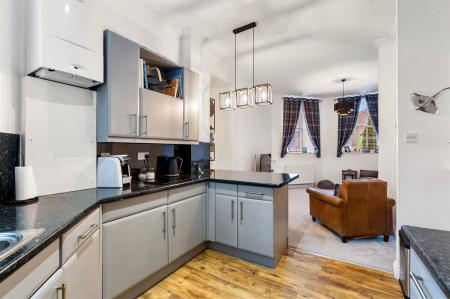 Offering two double bedrooms with en-suite facilities to the main, together with a bathroom, the quirky shaped property features unusually high ceilings, a wonderful open plan living room which incorporates a superbly fitted kitchen with a range of built-in appliances.