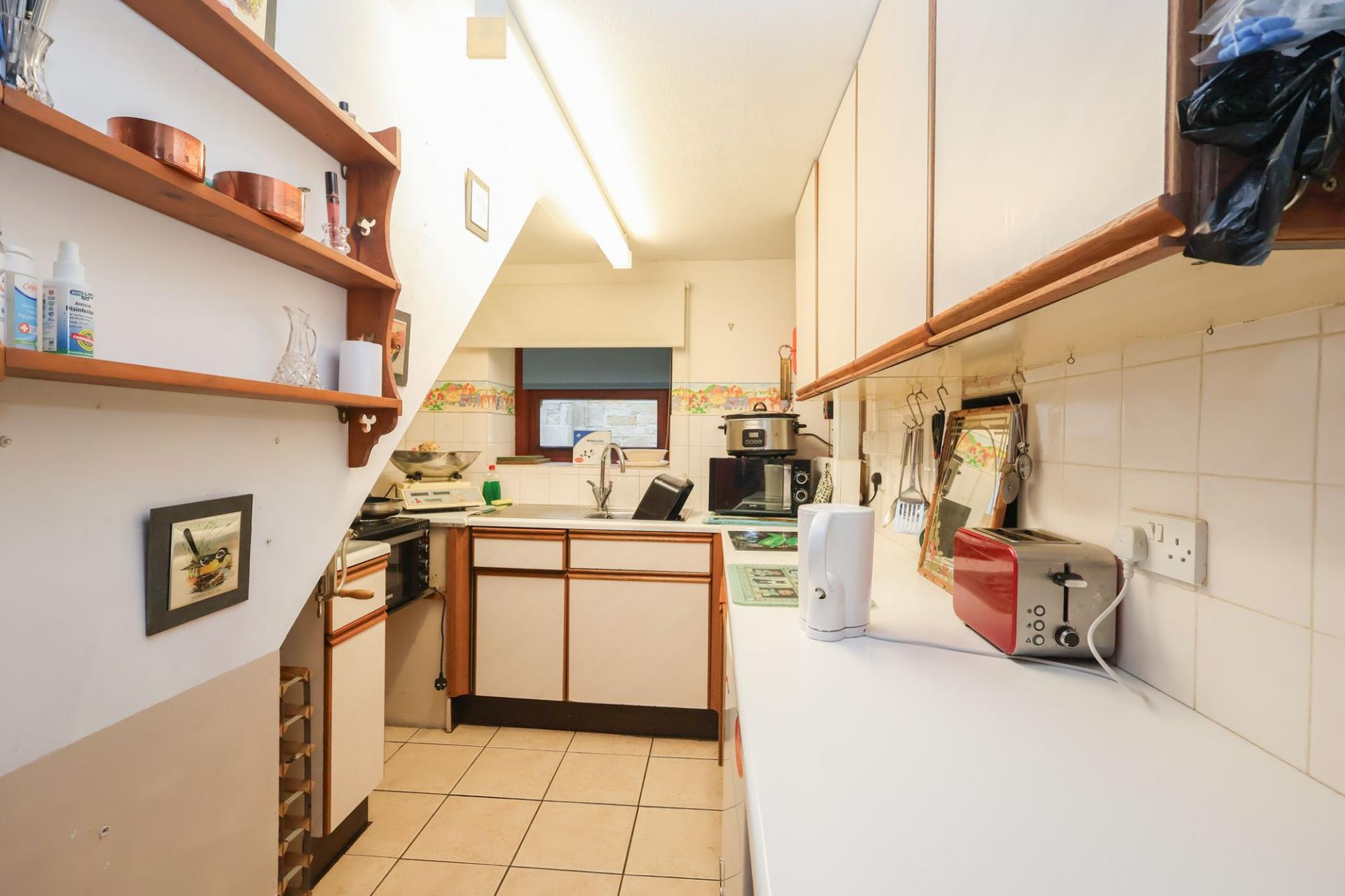 Step through the attractive storm porch and stable door, where you'll find a useful small hallway leading to the kitchen. The kitchen boasts a full range of light-coloured units, offering ample storage space and room for your preferred appliances. The living room has dual aspect windows and there's space not only for your living furniture but also for a small dining suite.