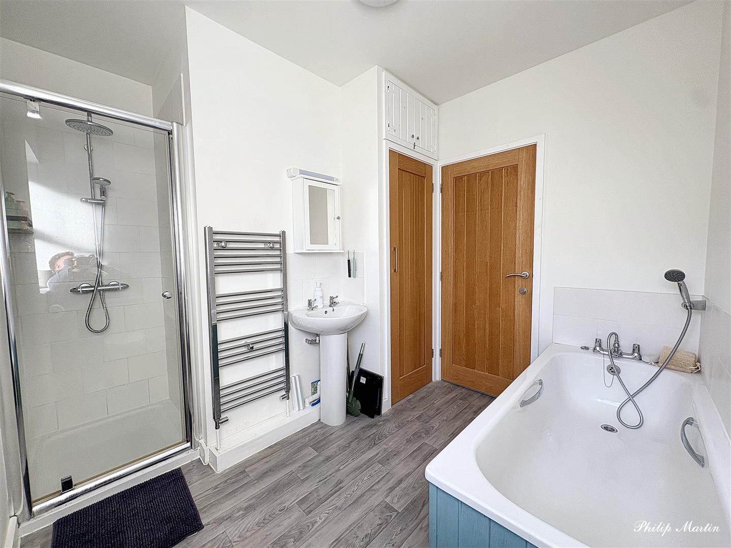 Bathroom - 1.94m x 2.58m (6'4" x 8'5") - Large shower cubical and bath with pedestal hand wash basin and low level w.c. Frosted window to front, heated towel rail extractor fan.