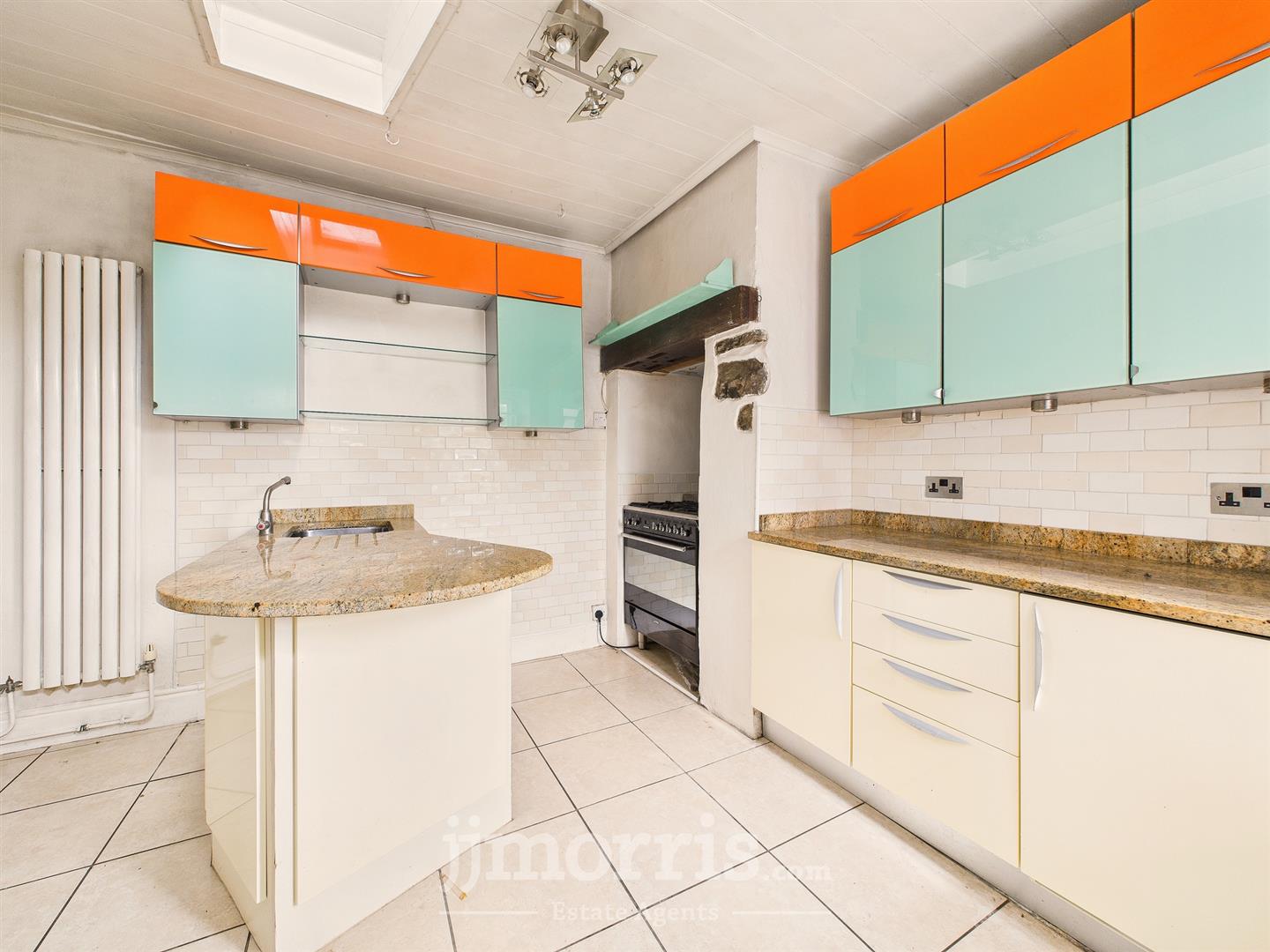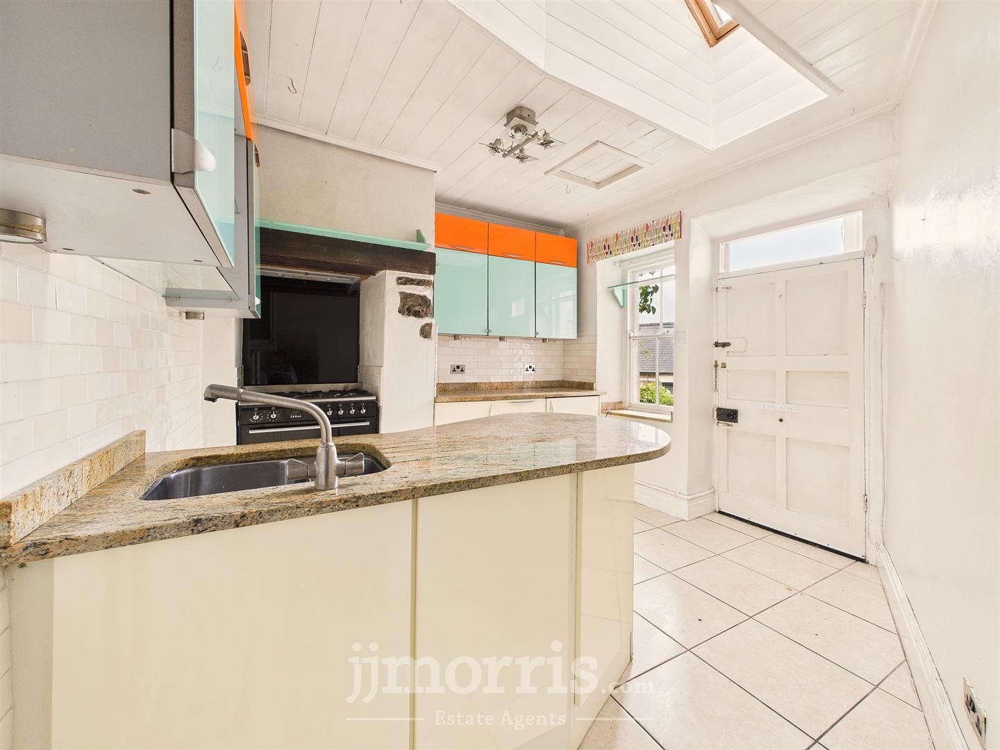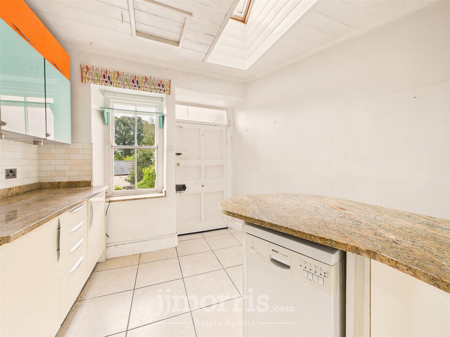 Kitchen - A modern fitted kitchen comprising a range of wall and base units with granite work tops and upstands, range style cooke with concealed extractor fan, inset sink unit, glazed display shelving, tiled walls, vertical radiator, tiled flooring. Window and door to the side. Velux roof window.