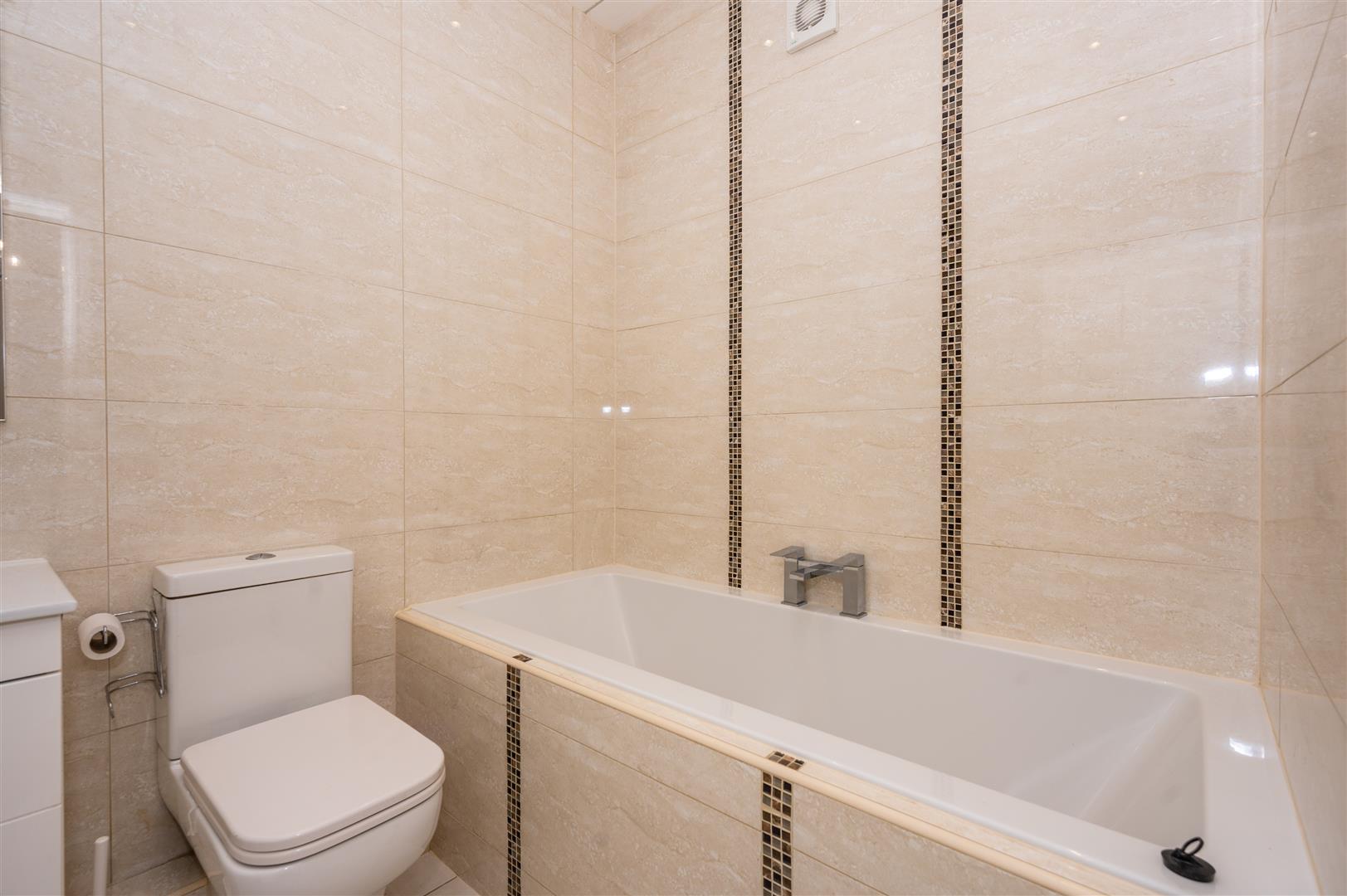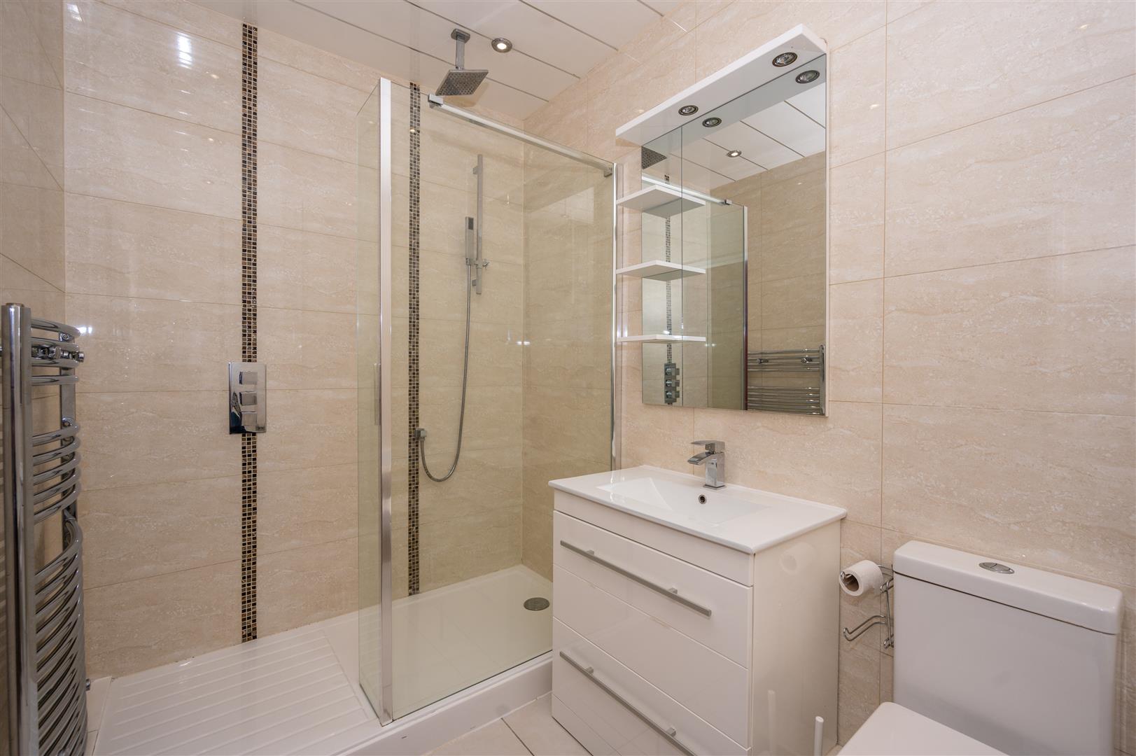 3.15 x 1.75 (10'4" x 5'8") - Four piece suite in white comprising; W.C, pedestal hand wash basin set in vanity unit, bath, stand in shower cubicle with power shower, heated towel rail, fully tiled walls, tiled flooring, ceiling spotlights.