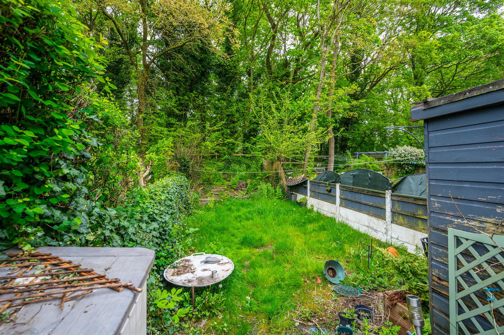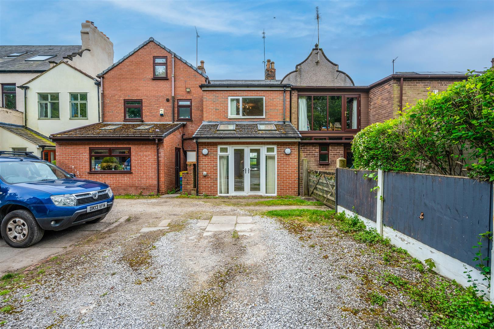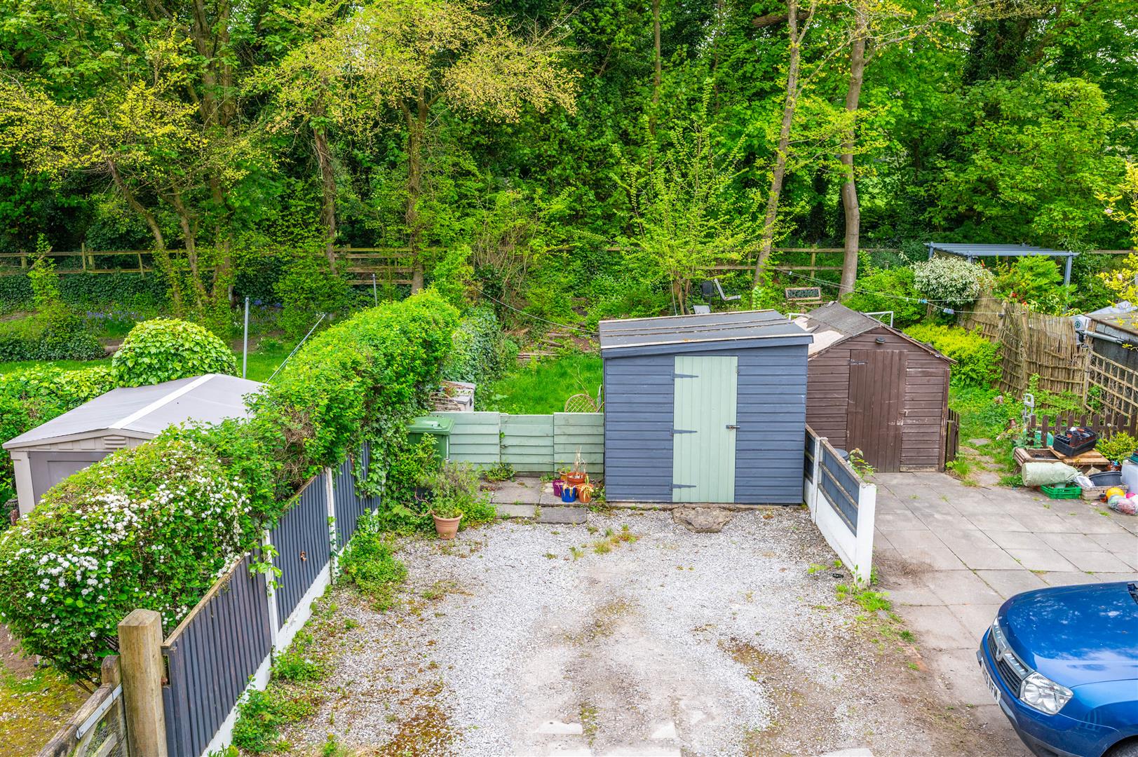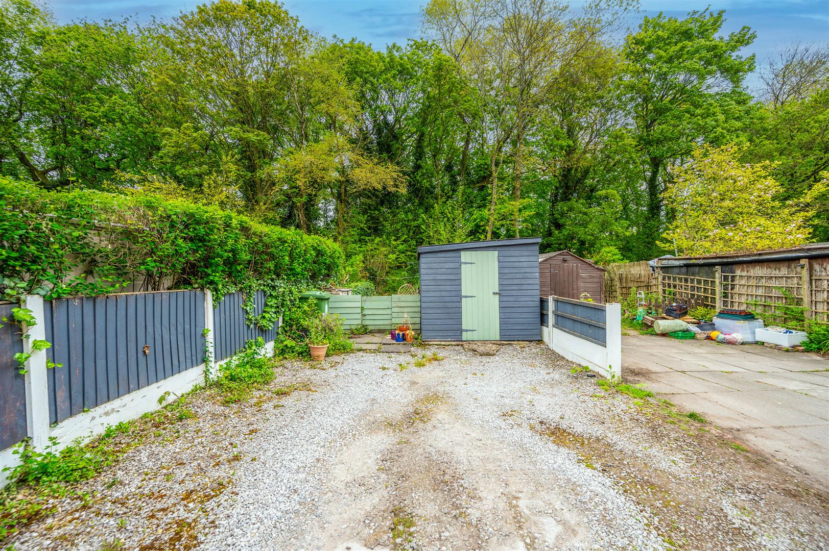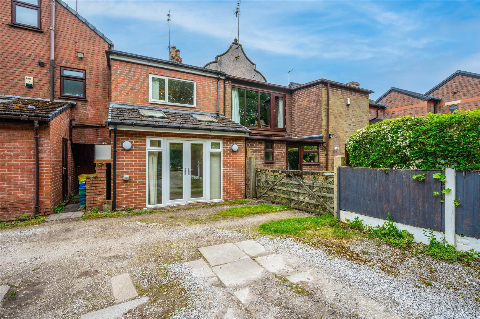 Paved garden area, gated access, brick and hedge boundaries.