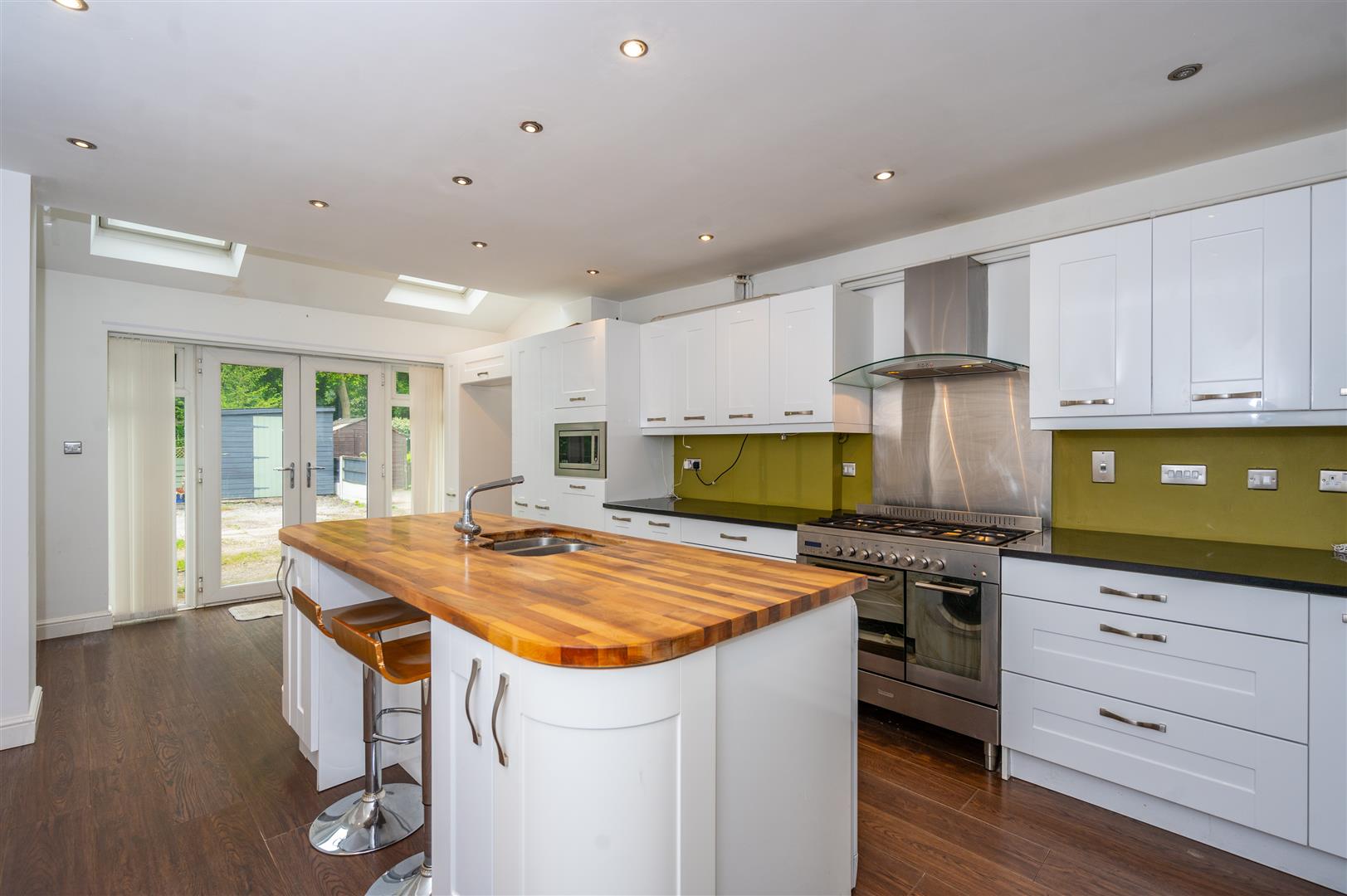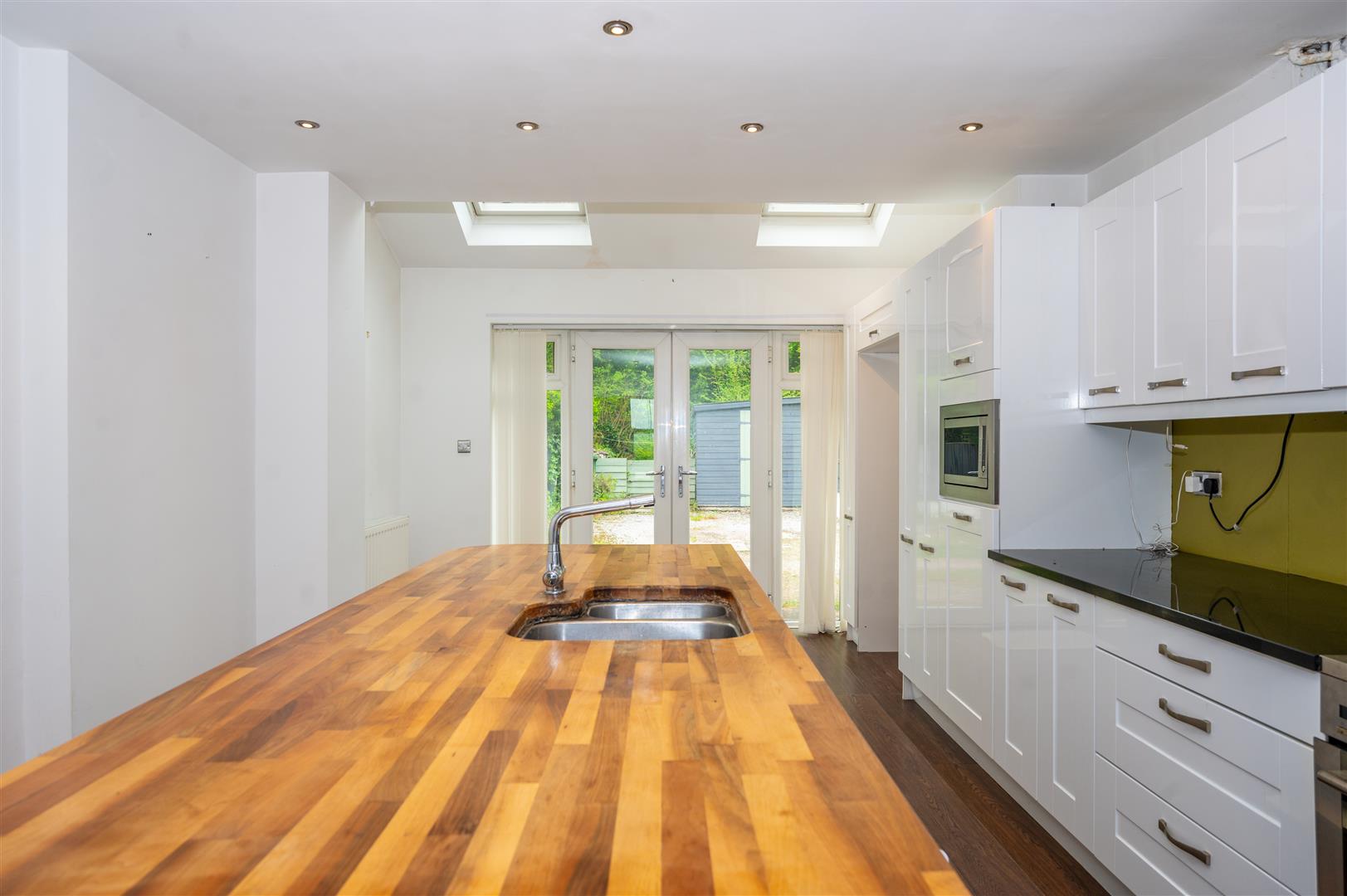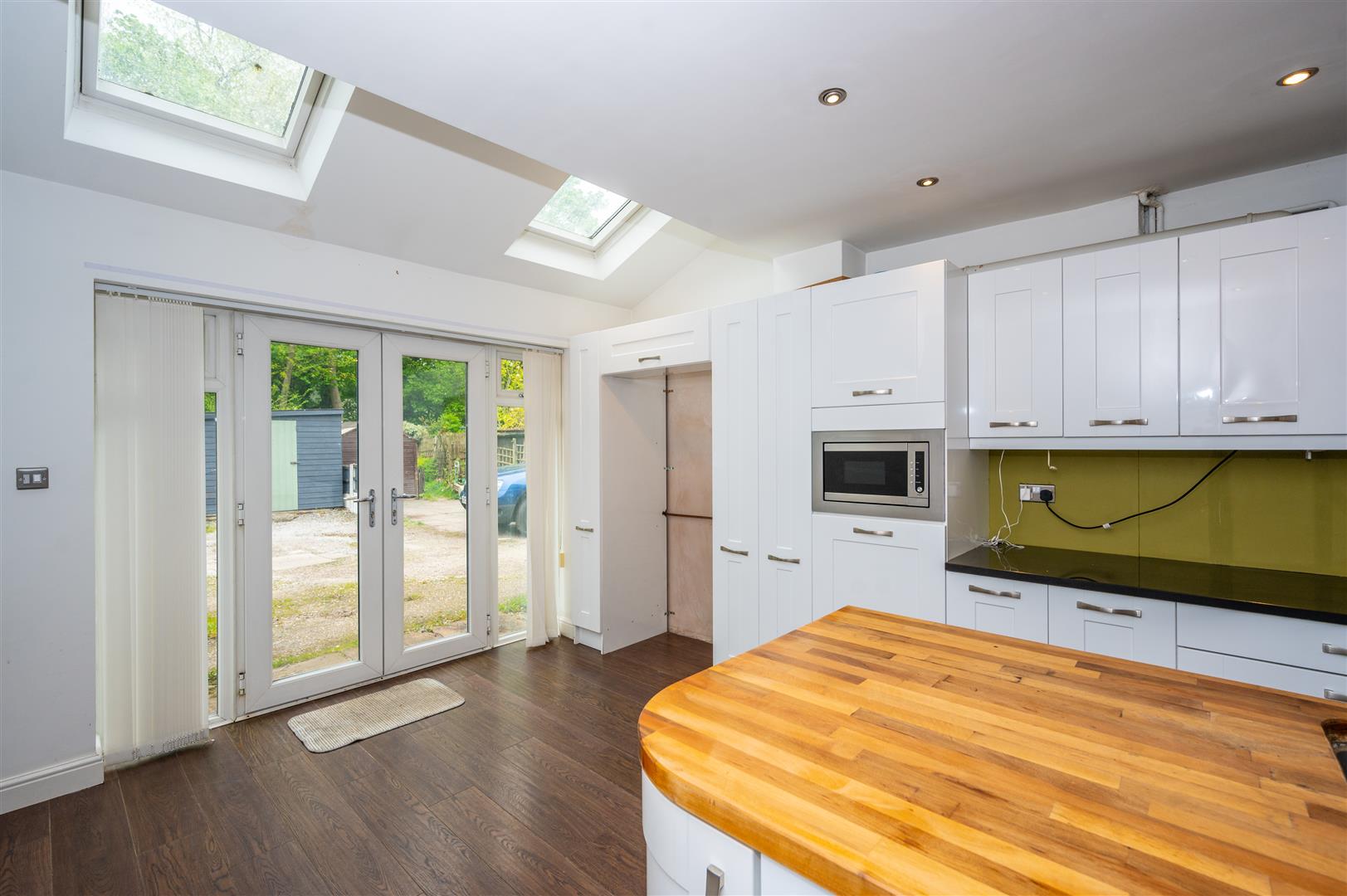 4.87 x 4.19 (15'11" x 13'8") - Two Velux windows, double glazed patio doors to the rear, range of modern wall and base units, contrasting worktops, breakfast island housing stainless steel sink unit with mixer taps and built in cupboards, double gas cooker point, extractor hood, built in microwave, fridge/ freezer point, plumbing for automatic washing machine, ceiling spotlights, laminate flooring, radiator.