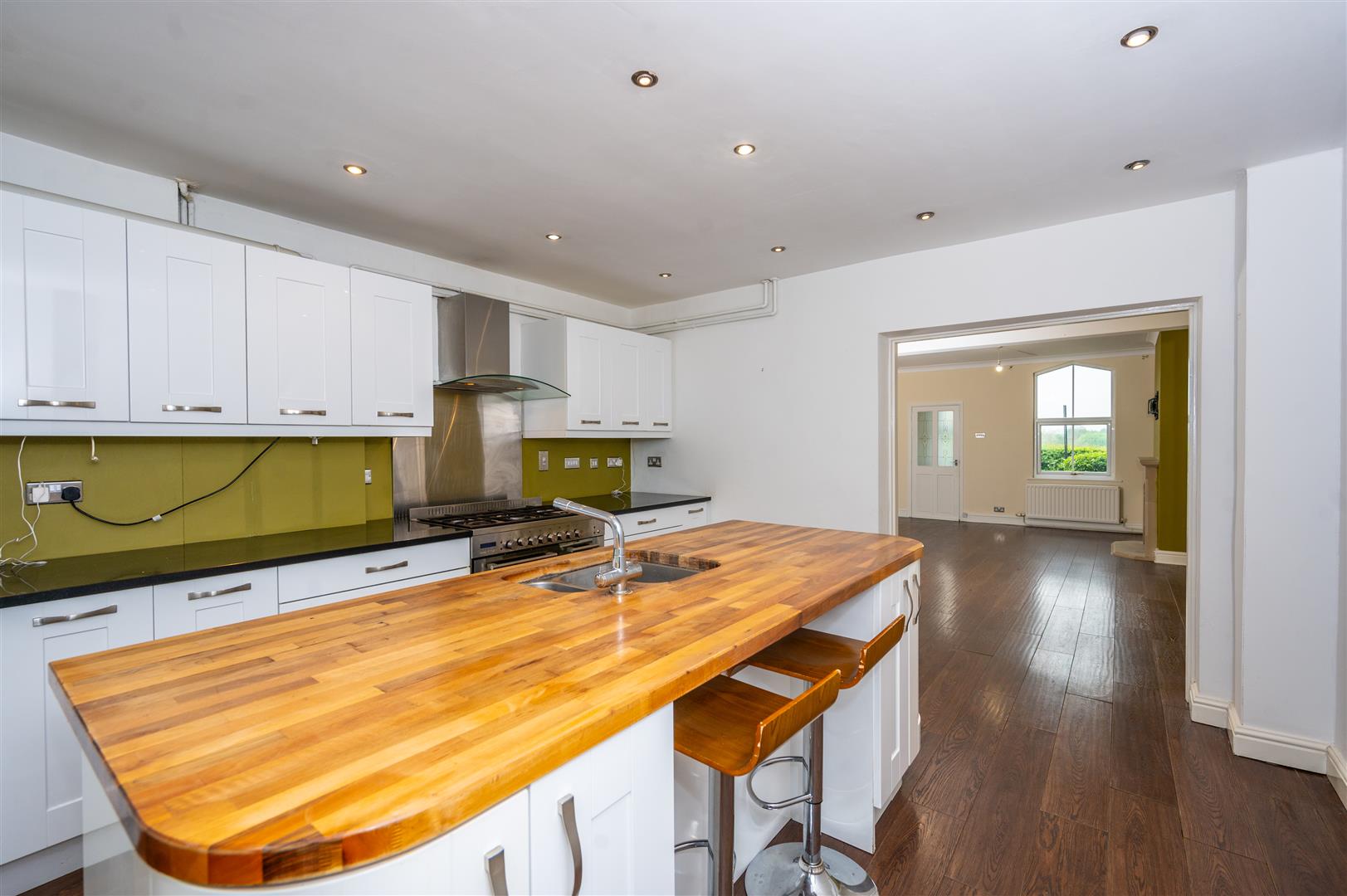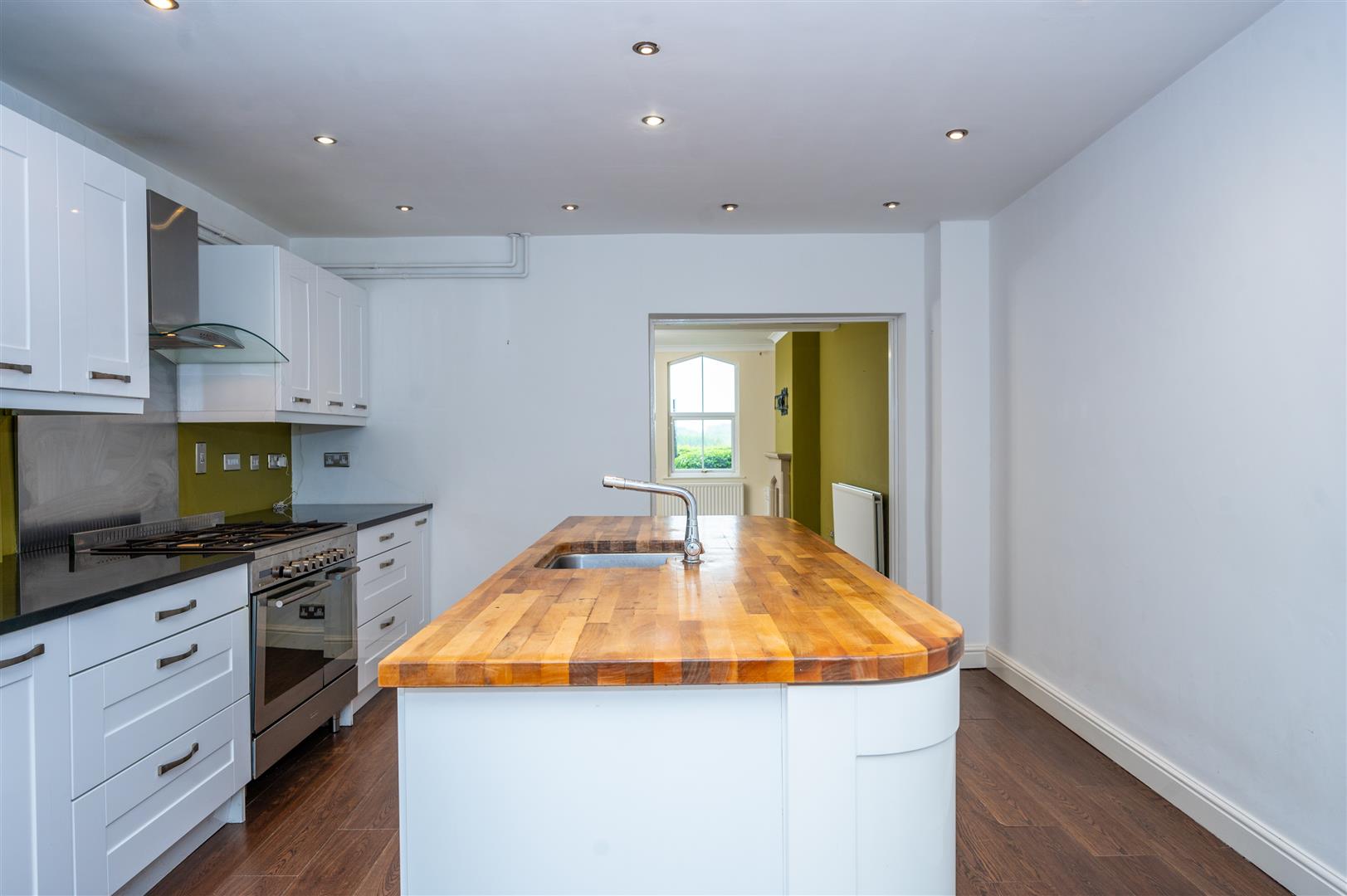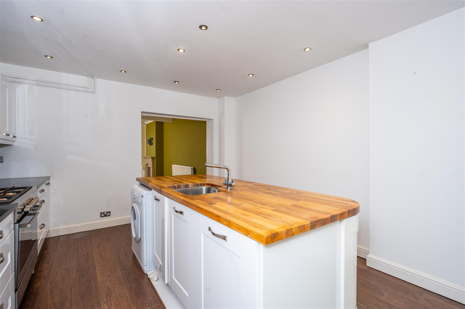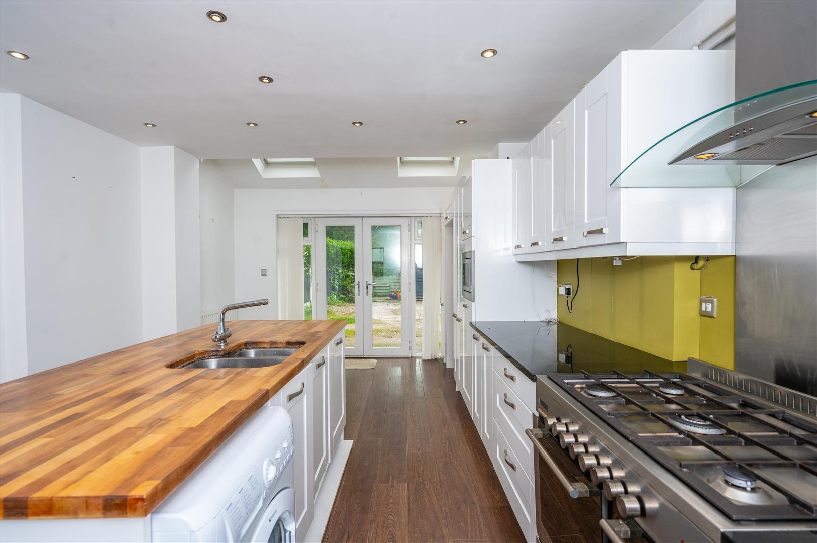 4.87 x 4.19 (15'11" x 13'8") - Two Velux windows, double glazed patio doors to the rear, range of modern wall and base units, contrasting worktops, breakfast island housing stainless steel sink unit with mixer taps and built in cupboards, double gas cooker point, extractor hood, built in microwave, fridge/ freezer point, plumbing for automatic washing machine, ceiling spotlights, laminate flooring, radiator.