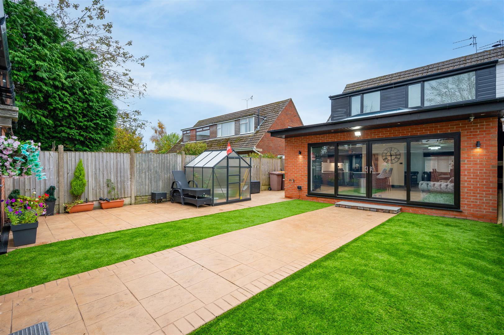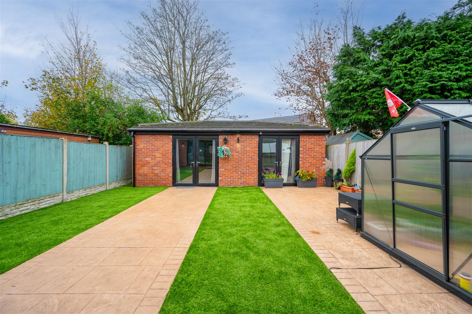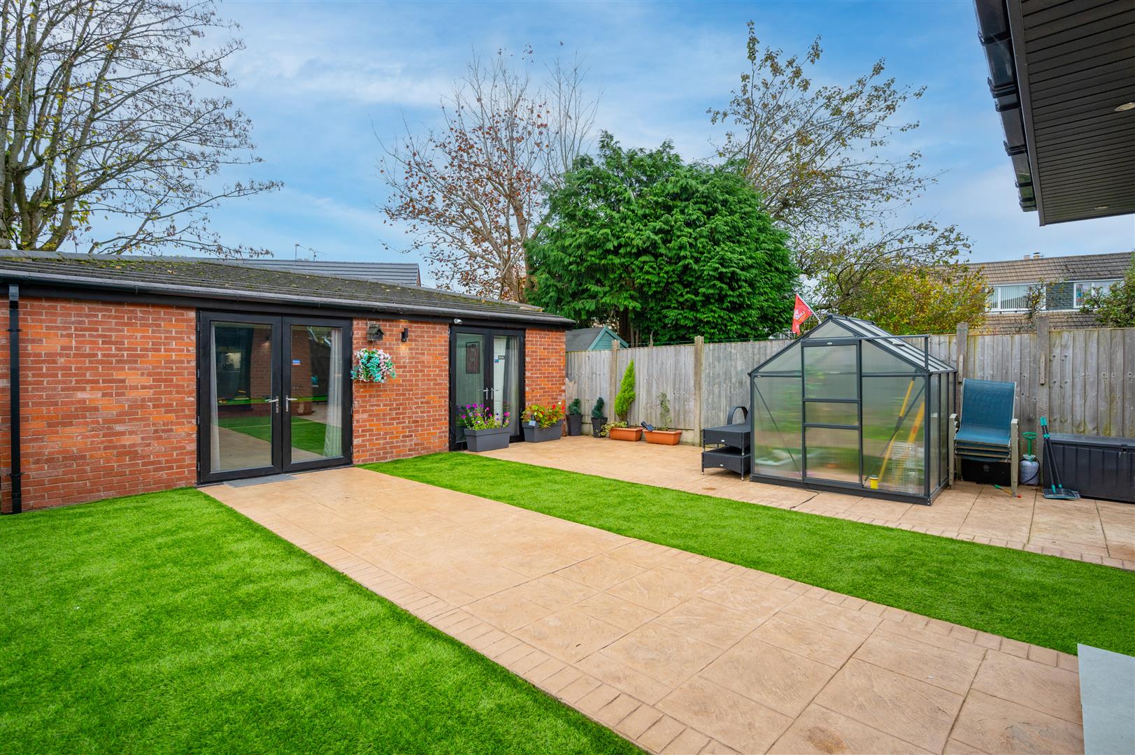 Externally, there's a patterned concrete driveway at the front providing ample parking. The rear features a garden and patio area with easy maintenance artificial turf, a converted snooker room with a full-size snooker table, and a WC. Outside, you’ll find hot and cold taps and sockets.