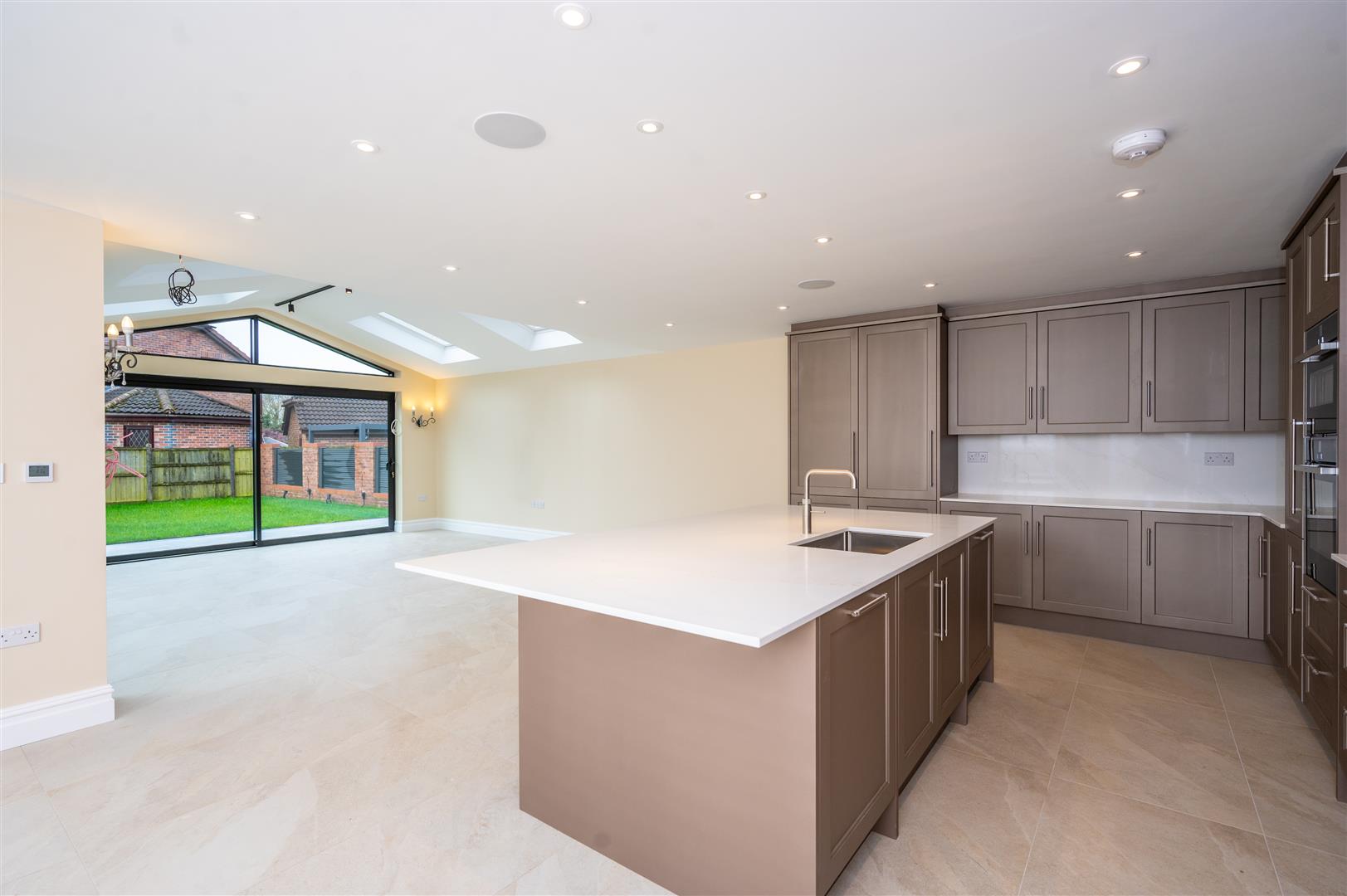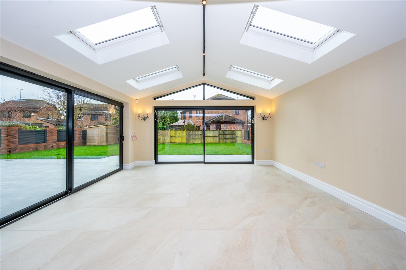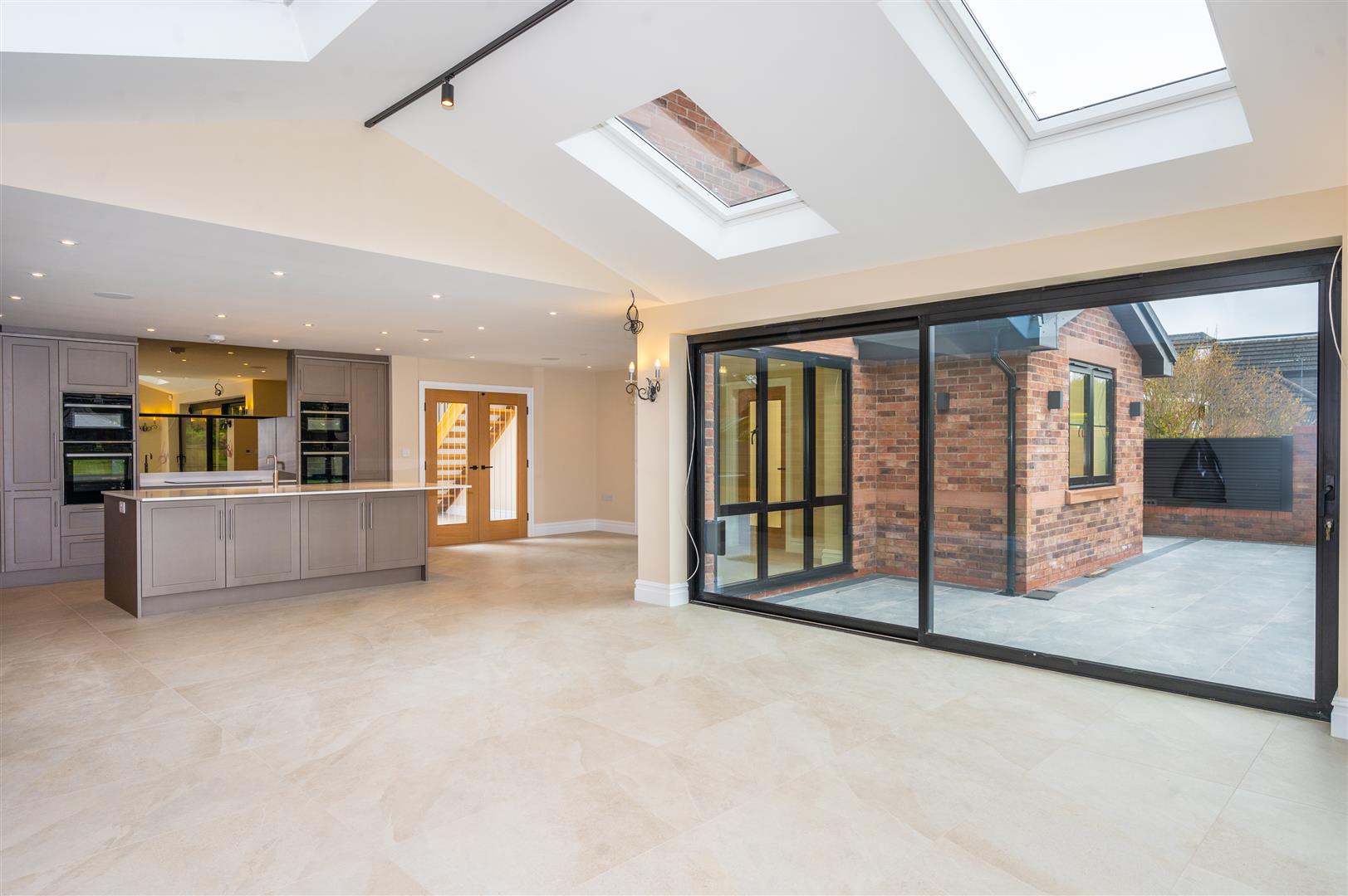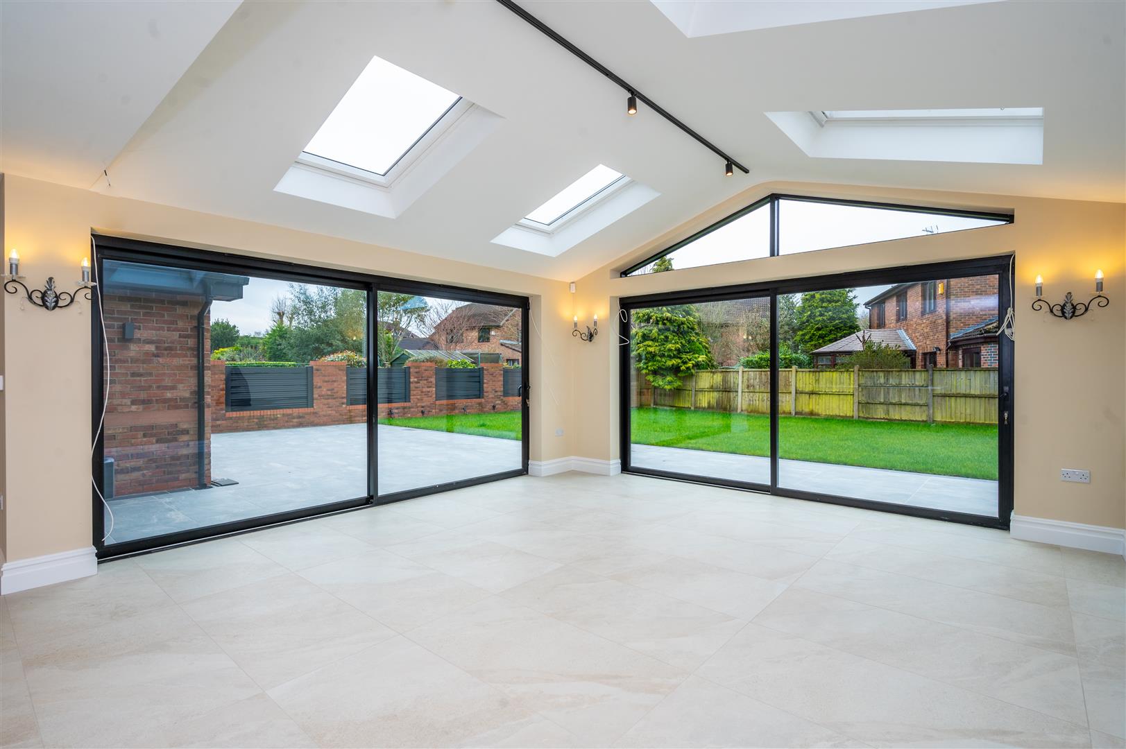 The ground floor is meticulously arranged to seamlessly blend entertainment areas with spaces for relaxation. Three expansive reception rooms offer versatility, accompanied by a spacious 37-square foot open-plan family dining kitchen. The kitchen boasts top-of-the-line integrated NEFF appliances and central feature island. This state-of-the-art kitchen flows into a sunlit living area, enhanced by impressive sliding patio doors. The living space effortlessly extends outdoors through multiple sets of fully opening sliding patio doors, leading to a premium sandstone patio terrace that envelops the property, creating a seamless transition between indoor and outdoor living. On the first floor, four luxurious double bedrooms await, each meticulously appointed with lavish en-suite bathroom facilities. Ascending to the second floor, you'll discover bedroom five with its own en-suite, alongside two additional rooms, offering versatile potential for various needs.