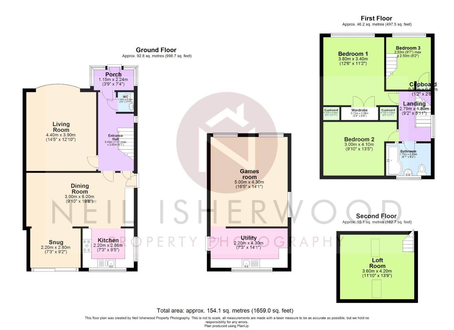 The property features a welcoming porch, entrance hallway, downstairs WC, a cozy living room, and an open-plan kitchen/dining area with an additional sitting space. Upstairs, there are three generously sized bedrooms and a modern family bathroom. Bedroom three includes stairs leading to a converted attic, offering additional versatile accommodation.