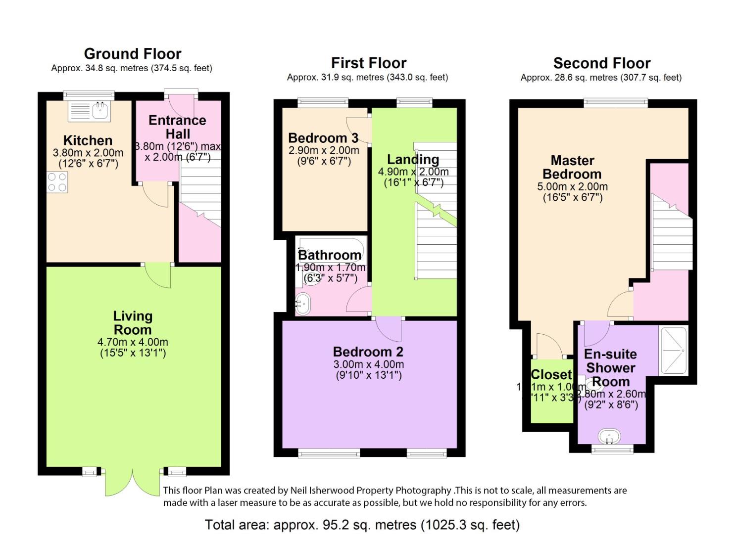 The generous living space encompasses an entrance hallway, a contemporary kitchen/diner, and a roomy lounge that opens up to the rear garden through double doors. On the first floor, you'll find two bedrooms and a family bathroom. The second floor hosts a luxurious Master suite complete with fitted wardrobes and a spacious ensuite bathroom.