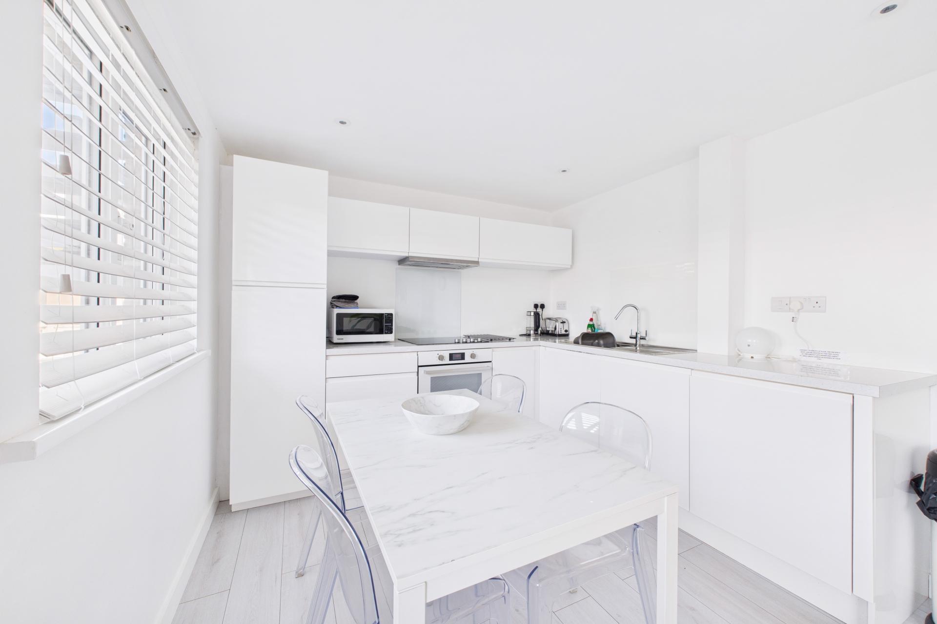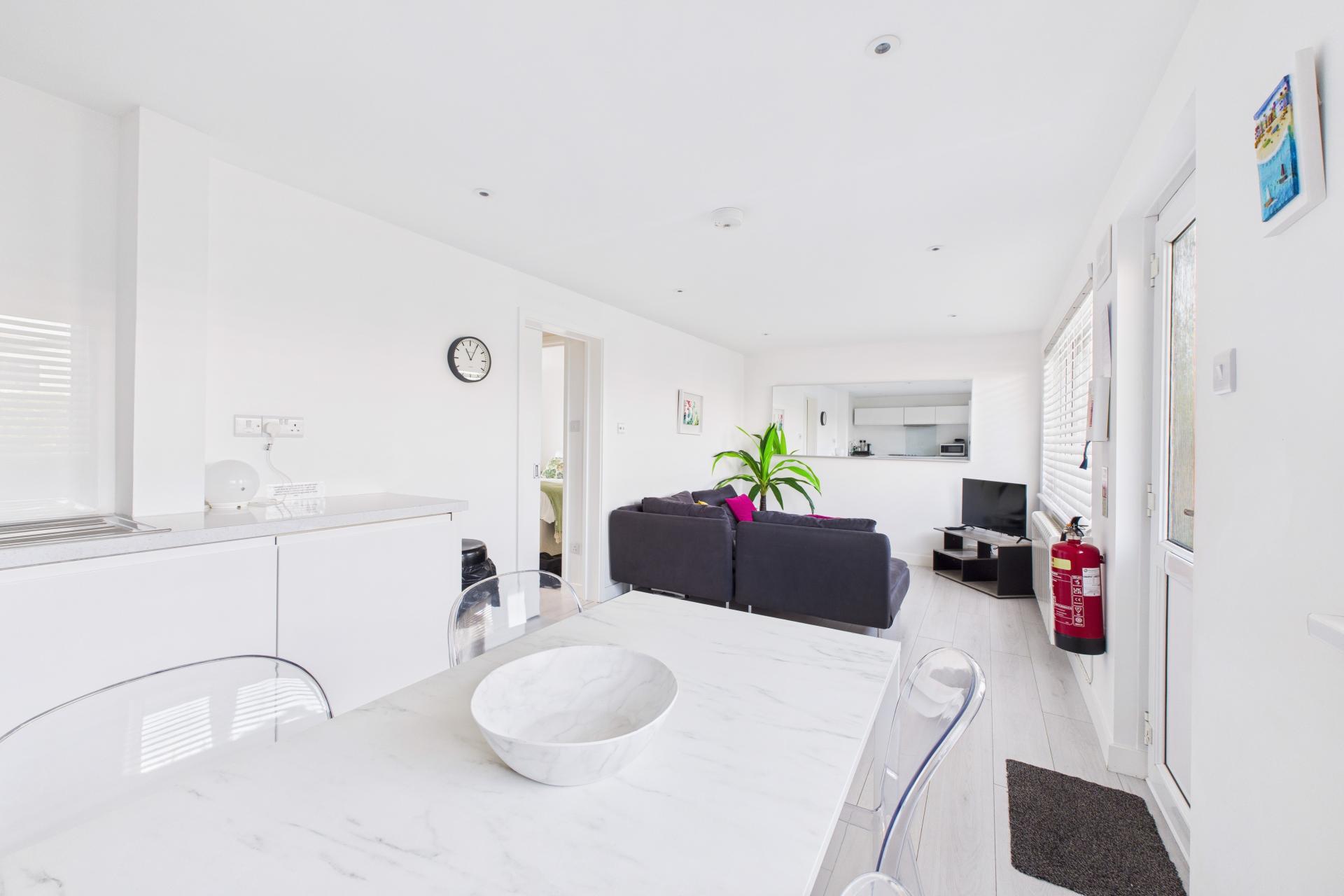 Beautiful, spacious and light open plan living area comprising kitchen / diner and lounge. Two double glazed windows to the front with double glazed door entrance, electric wall mounted radiator, ample power points. Kitchen offers an extensive range of eye and base level units in gloss white with ample worktop space over, stainless steel sink unit and drainer with taps over, integrated fridge with freezer box above, four ring hob with electric oven under and extractor fan over. Lounge area offers TV point and power points with large fitted wall mirror