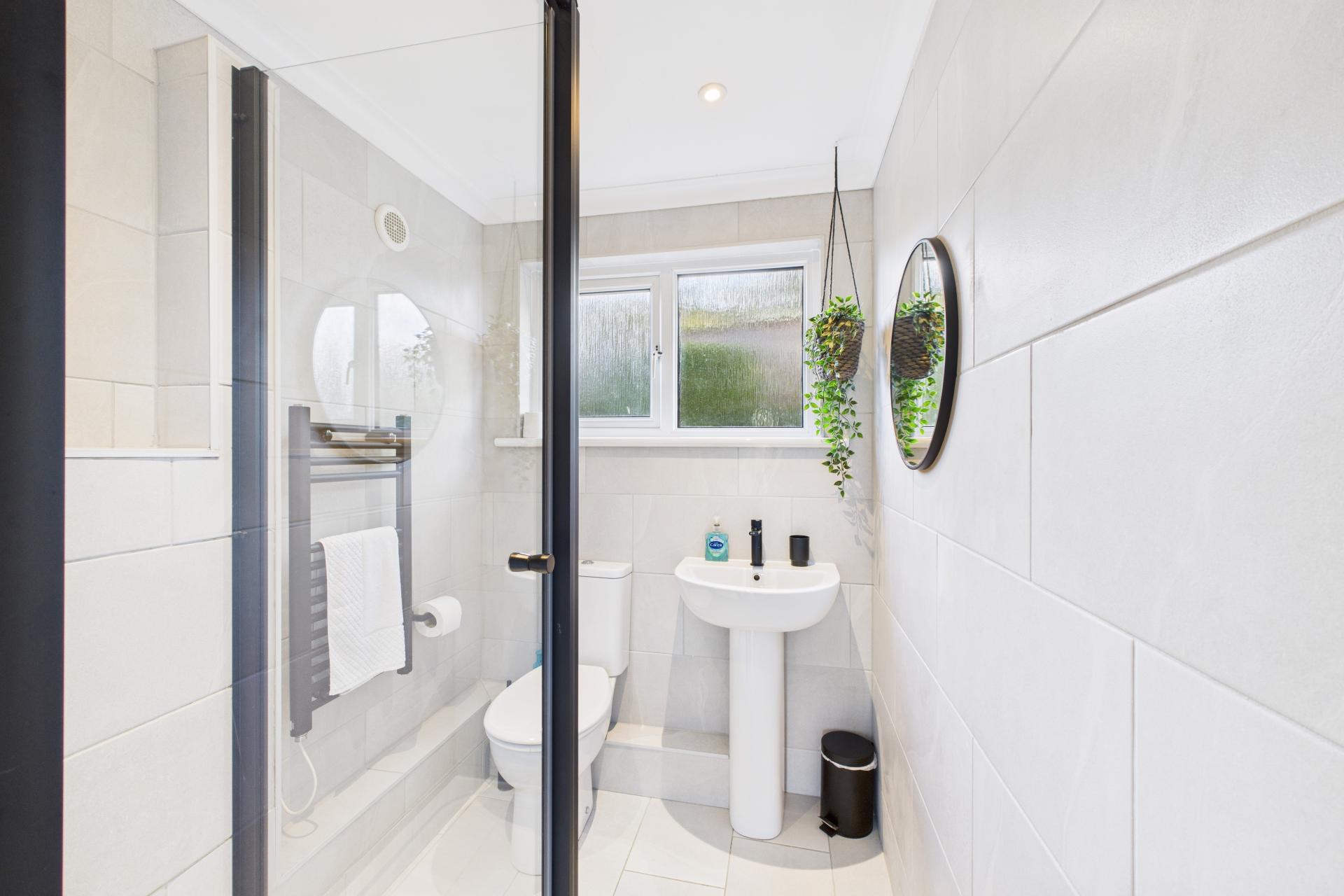 Fully tiled floor and walls, pedestal wash hand basin, close couped WC, walk in shower cubicle with electric shower inset, heated towel rail, double glazed frosted window to the rear