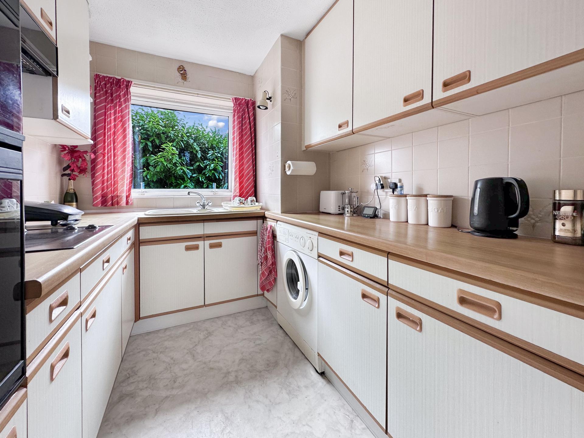 Range of eye and base level units with worktop surfaces over, one and quarter sink unit and drainer with taps over, 4 ring electric hob and extractor, eye level double oven and grill, space for fridge, plumbing for washing machine, double glazed window to the rear, power points