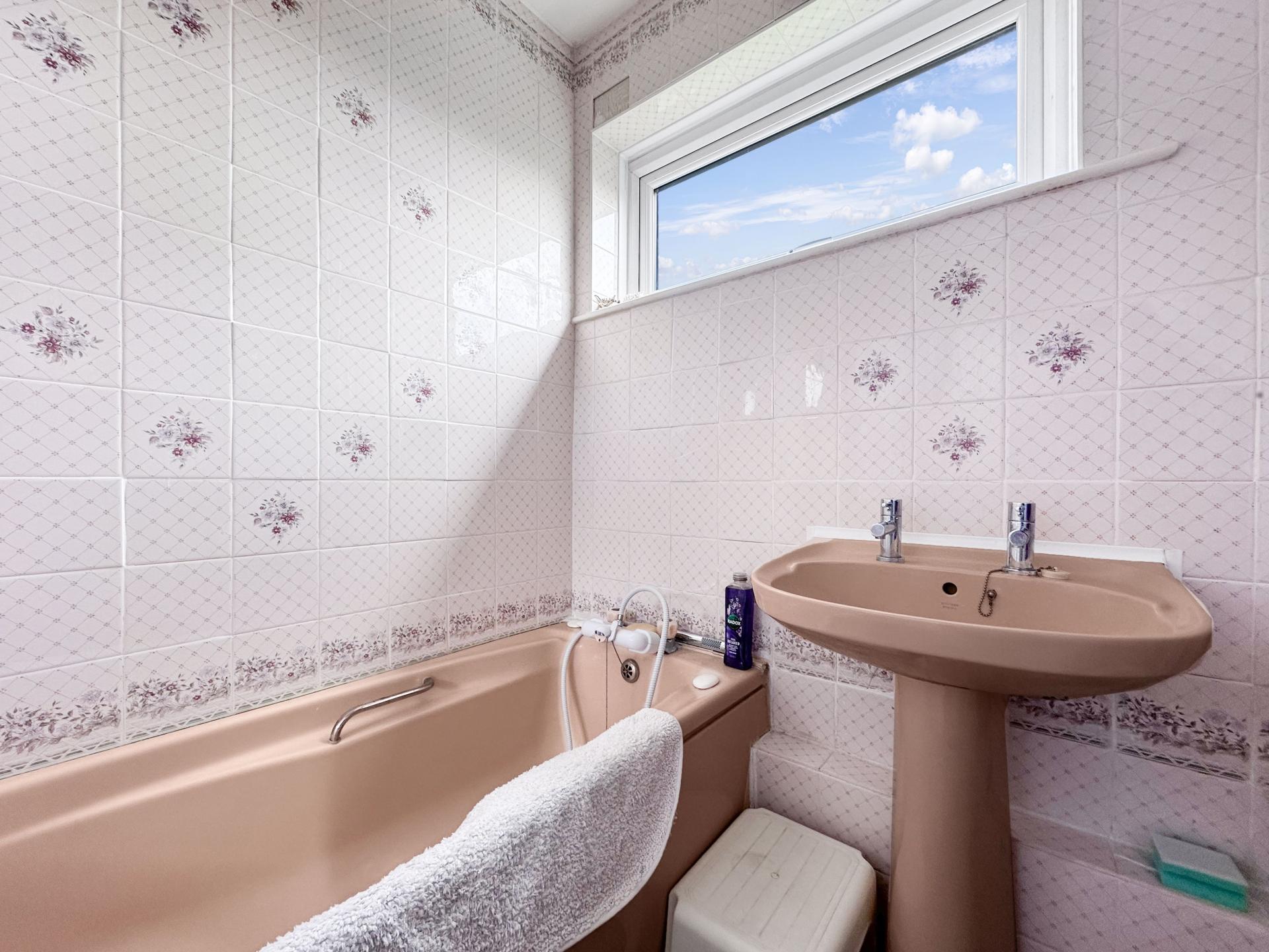 Window to the side with sea views, close coupled WC, panelled bath, pedestal wash hand basin, built in storage cupboard
