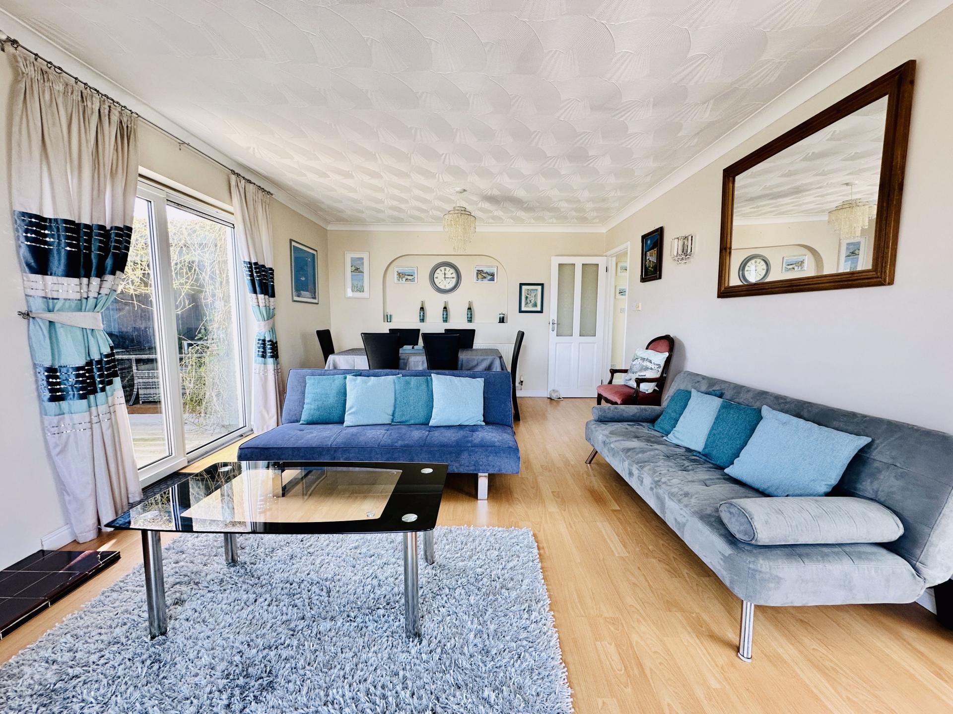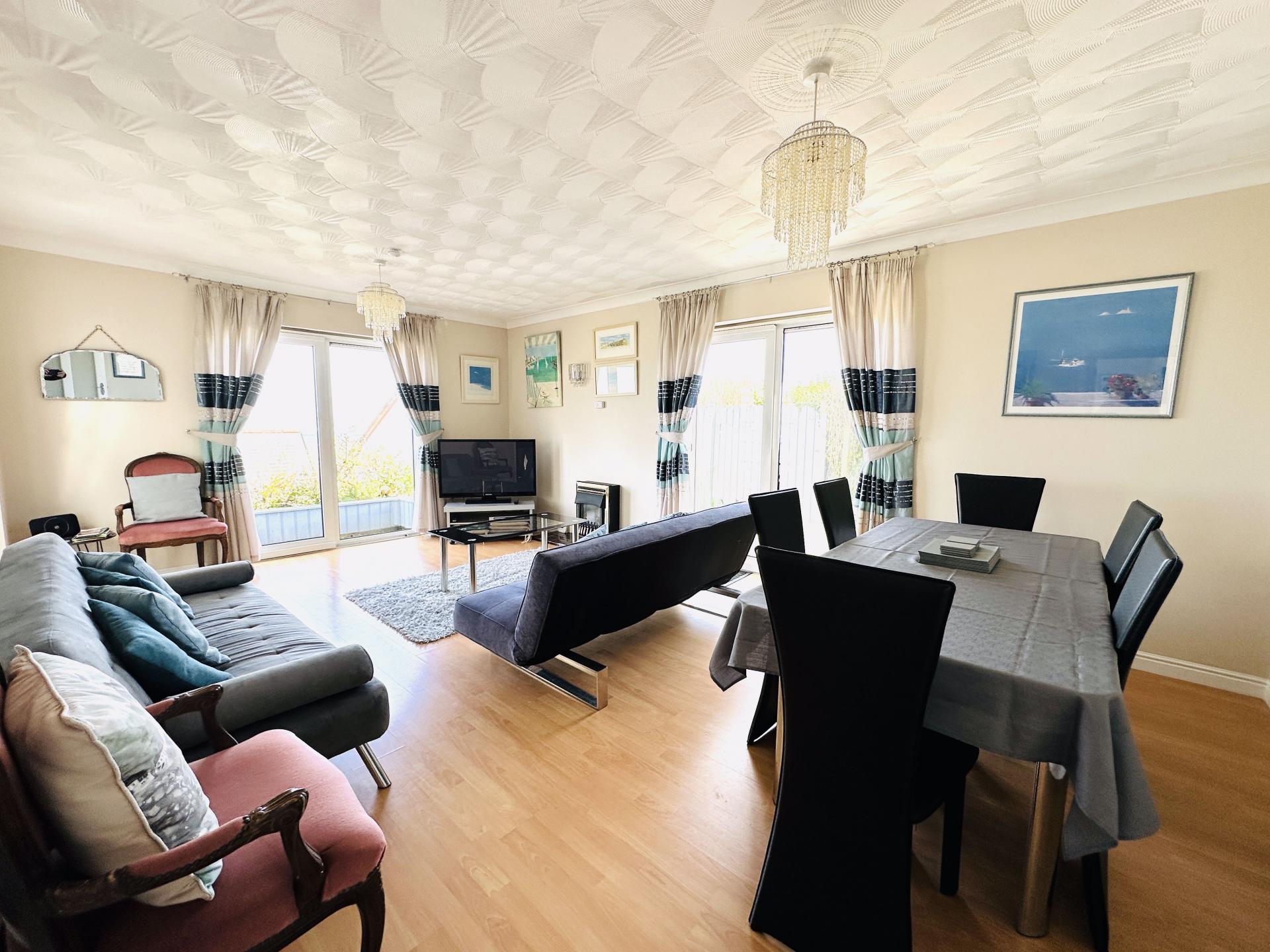Lovely room with double glazed doors to the front opening onto a front patio and offering splendid views and the side patio doors opening onto a side decked area. radiator, power points, tv point, coved ceiling, tiled hearth with space for electric fire onset