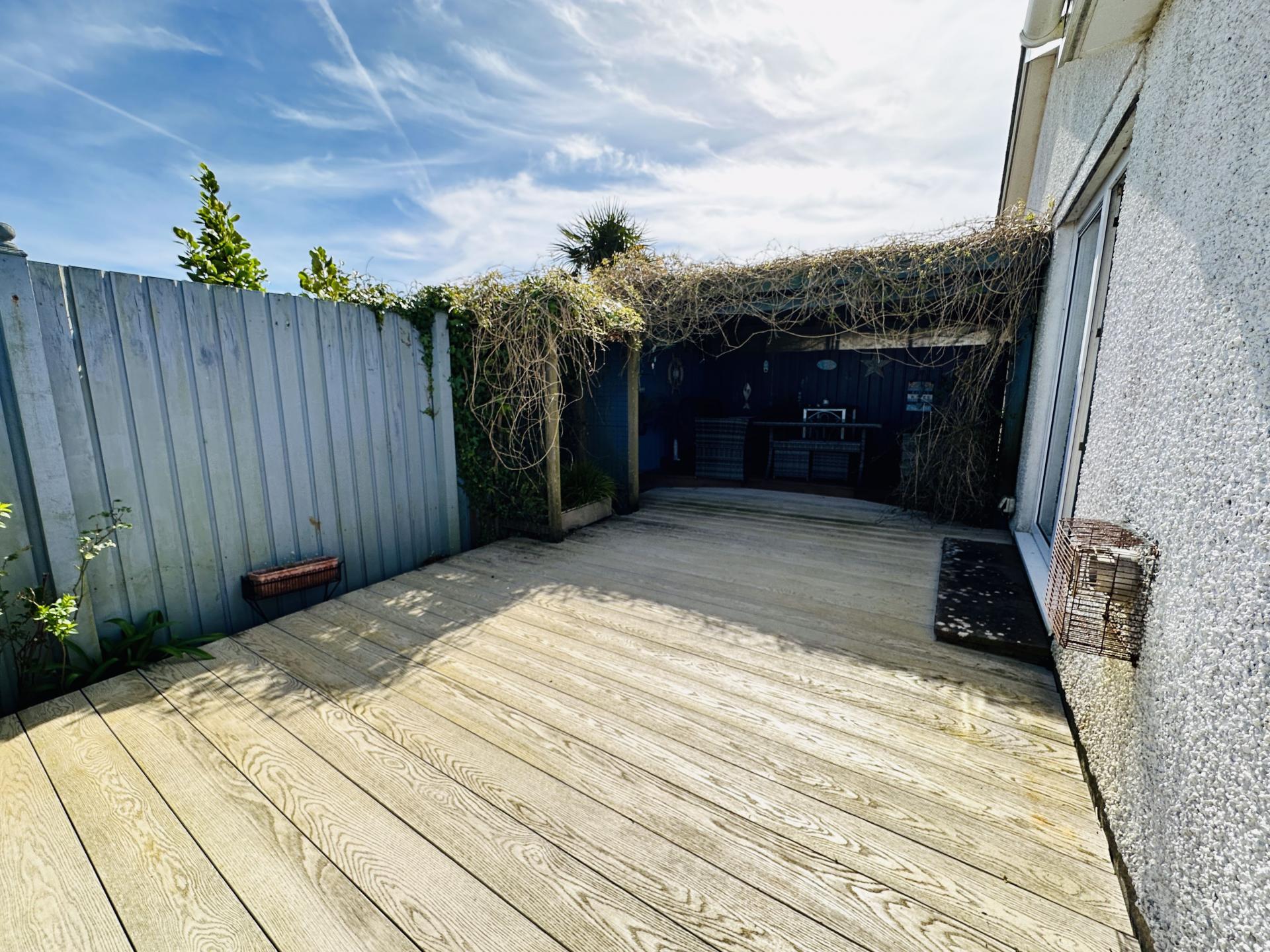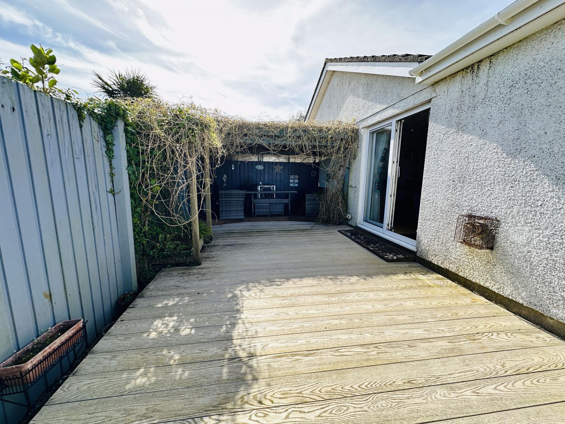 To one side of the property is a decked area with covered pergola and to the other side path access to the rear courtyard.