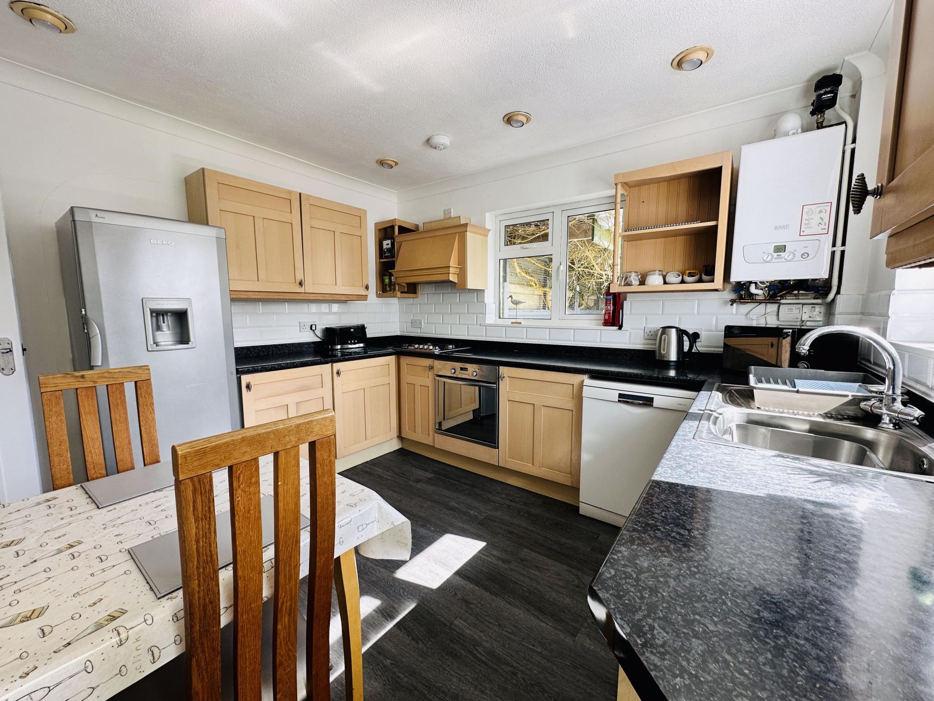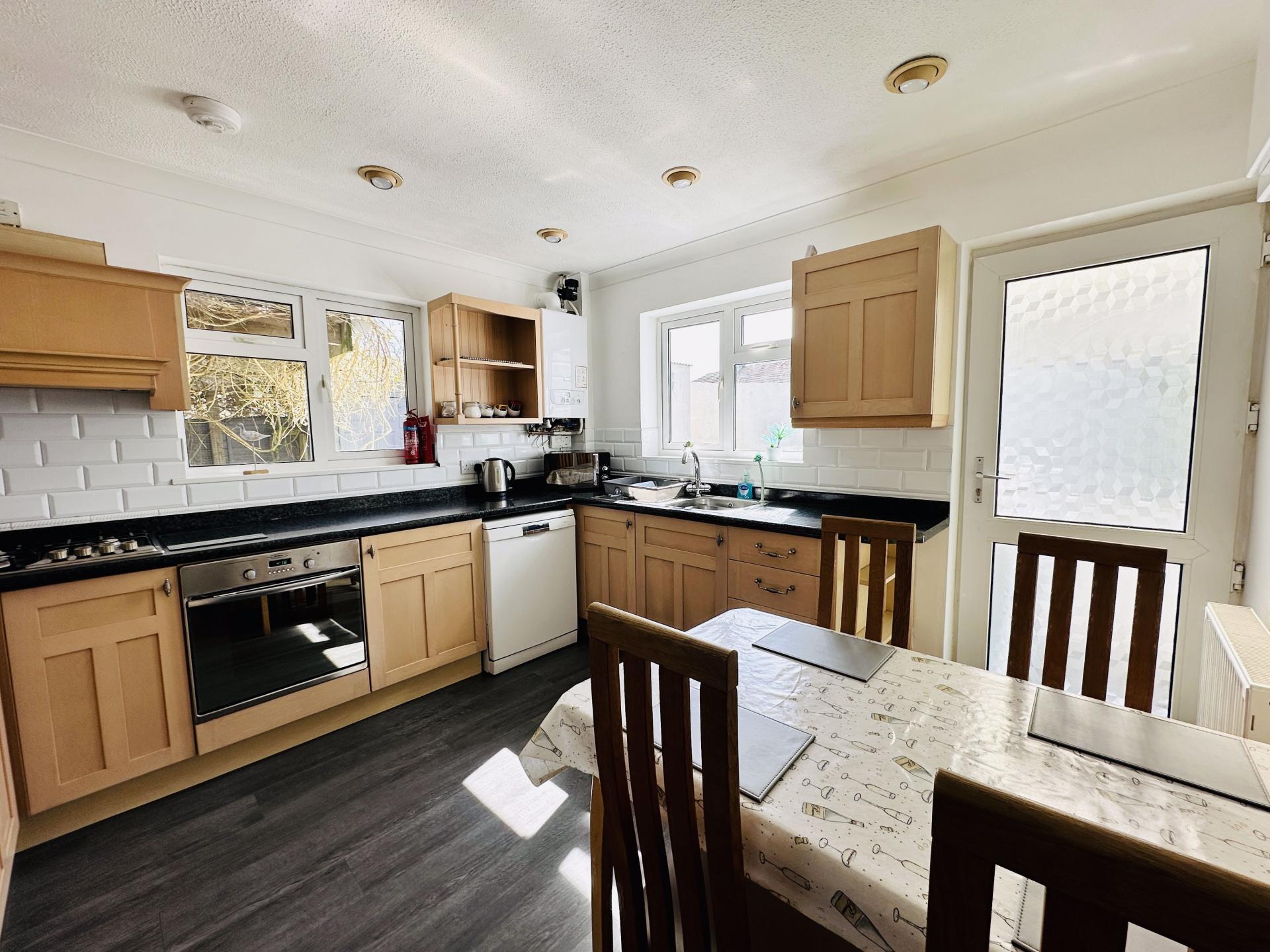 An excellent range of eye and base level units with ample worktop surfaces over, fitted electric oven and 4 ring gas hob with extractor fan over, complimentary tiling, stainless steel sink unit and drainer with mixer taps over, space for fridge freezer and plumbing for dishwasher, double glazed window to the side and further window to the rear, ample power points, radiator, door to