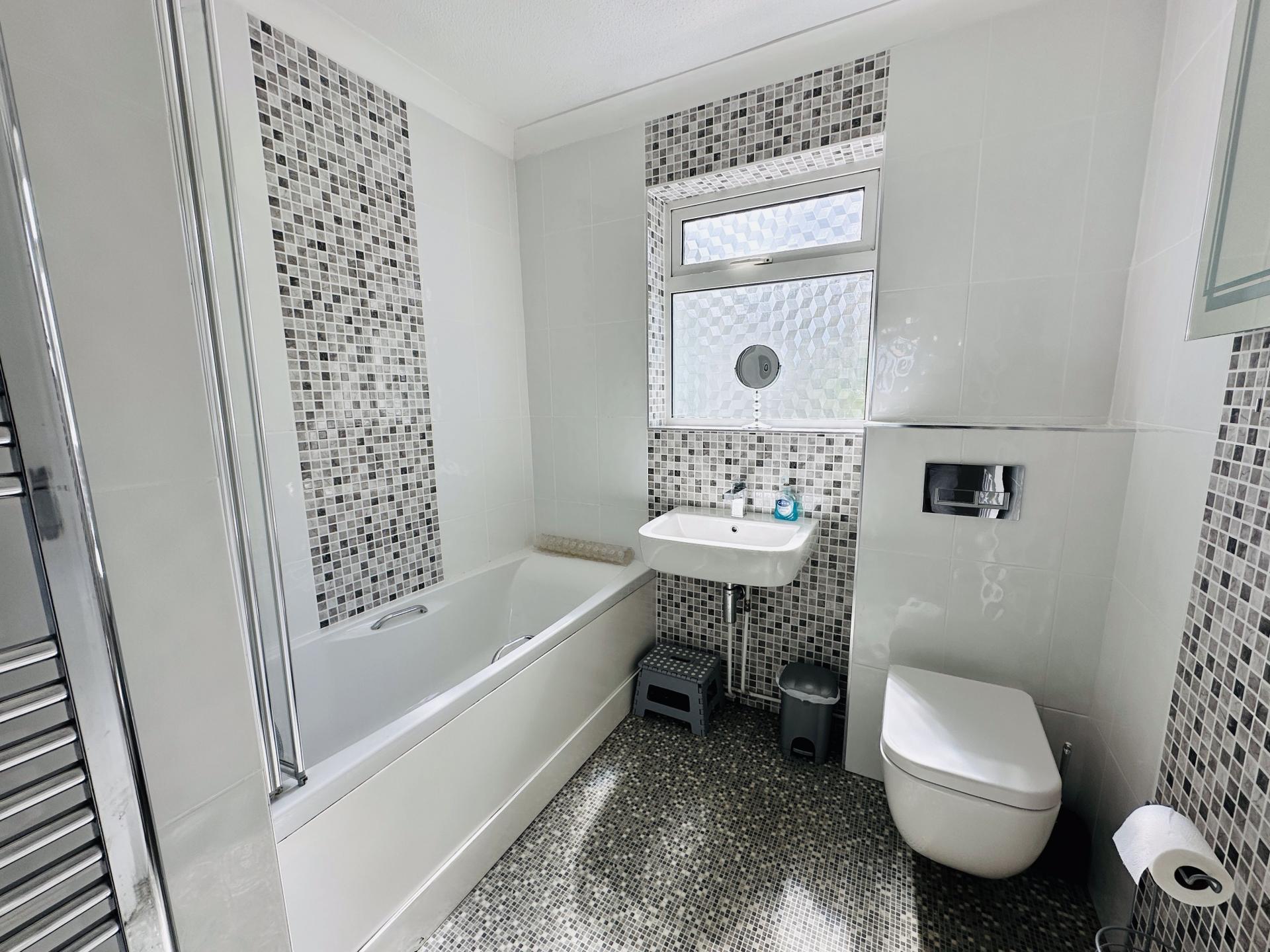 Recently upgraded. Vinyl flooring, chrome heated towel rail, wall hung WC, wall hung wash hand basin, panelled bath with shower attachment over, fully tiled walls, UPVC double glazed window to the rear, extractor fan, fitted wall mirror with lighting and shaver point