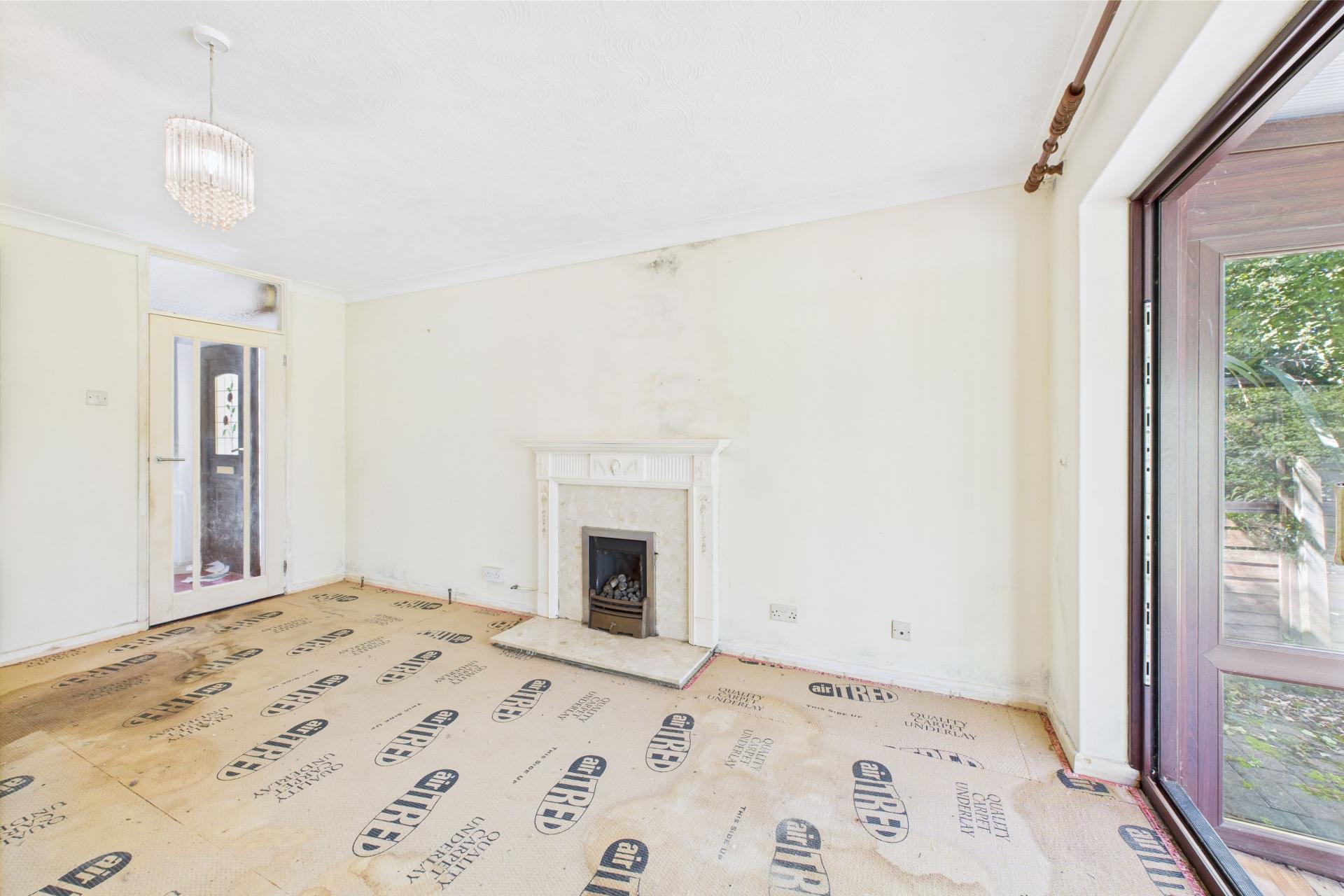 Great size room with fixed wall fireplace surround and living flame effect gas fire inset ( not tested ), radiator, power points, door to kitchen and door to conservatory