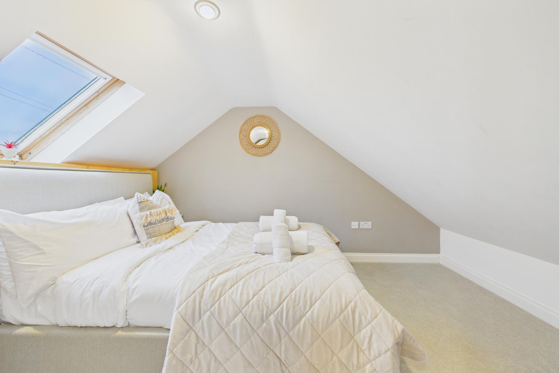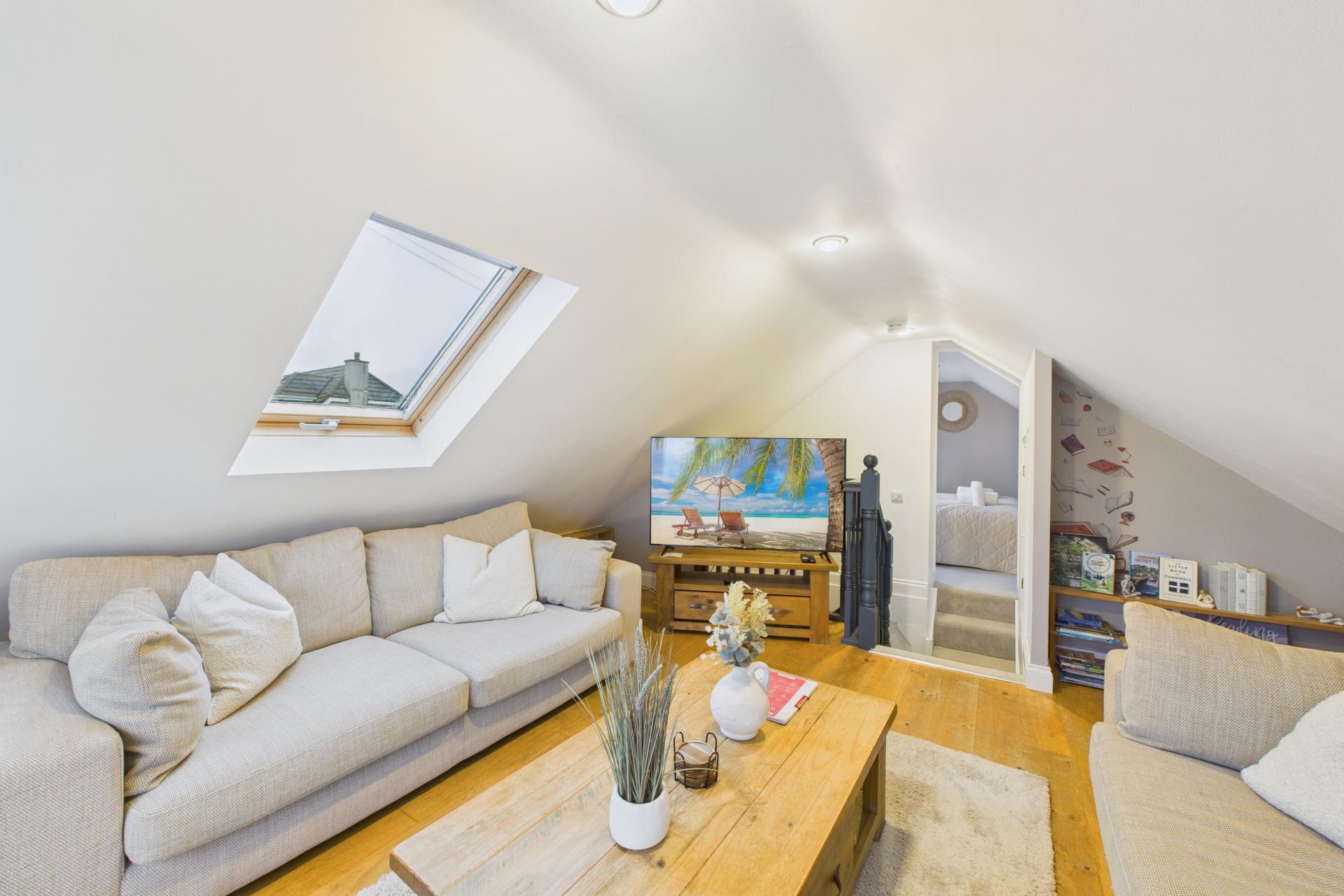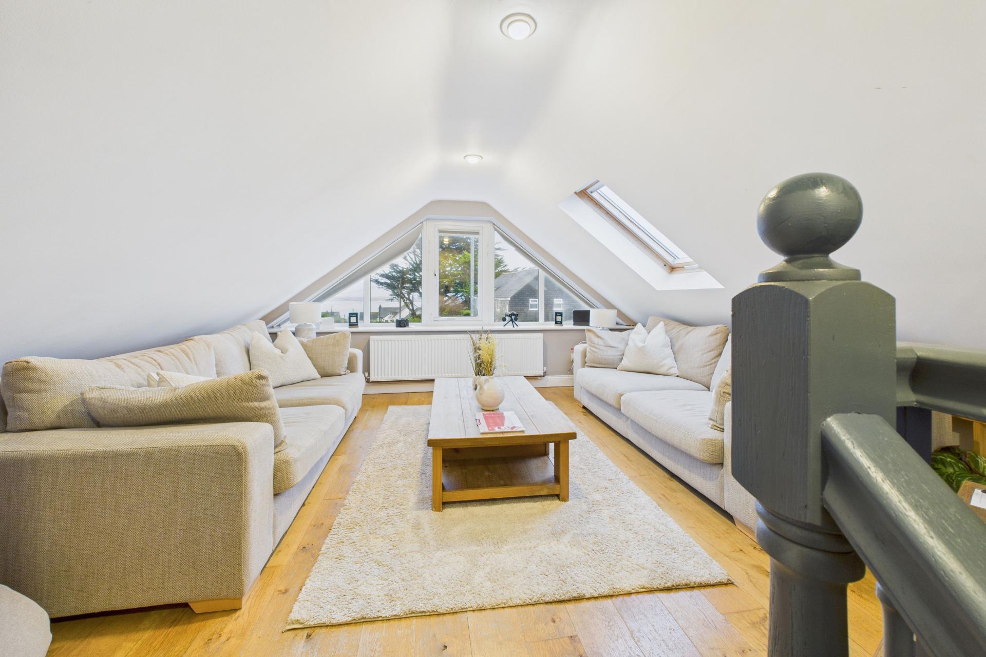 Lovely room, super bright and light having bespoke UPVC double glazed windows to the front offering a fine sea and coastal views over to Godrevy Lighthouse and beyond, Velux window to the side, radiator, oak flooring, ample power points. Pitched ceiling.