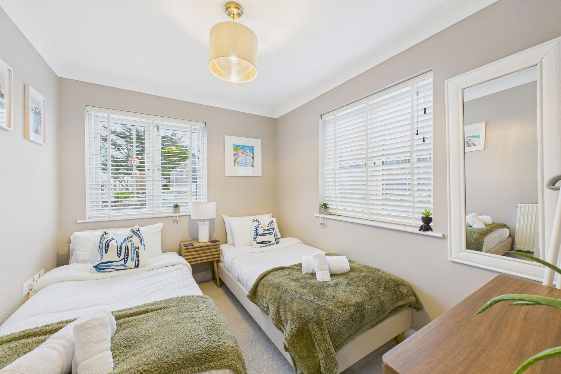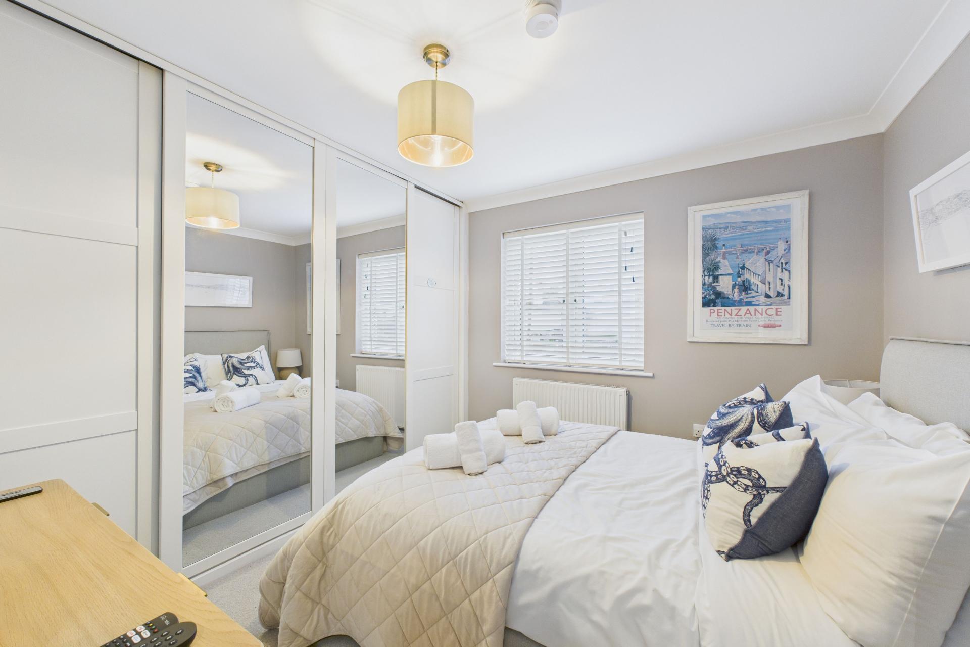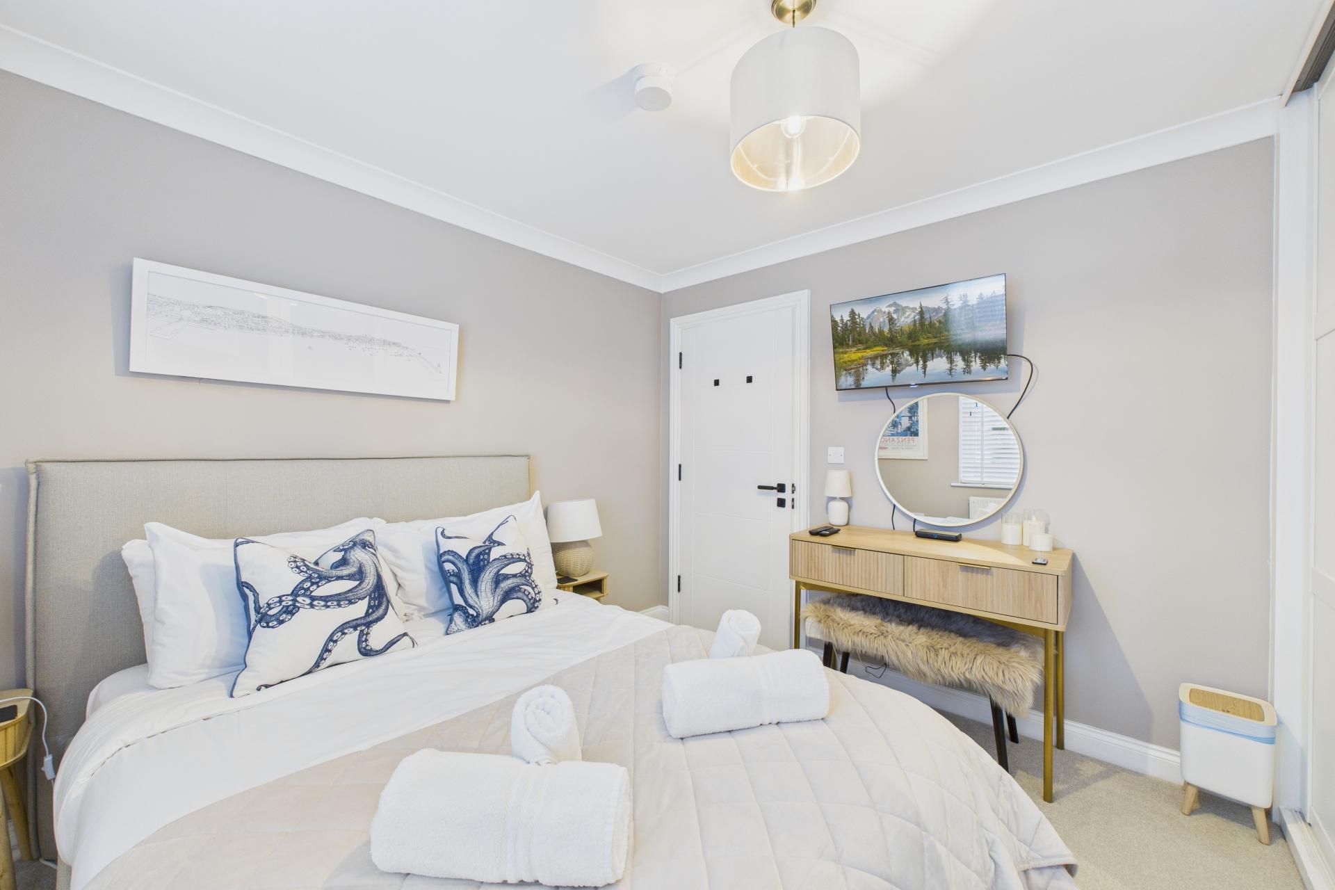 Lovely room, super bright and light having bespoke UPVC double glazed windows to the front offering a fine sea and coastal views over to Godrevy Lighthouse and beyond, Velux window to the side, radiator, oak flooring, ample power points. Pitched ceiling.