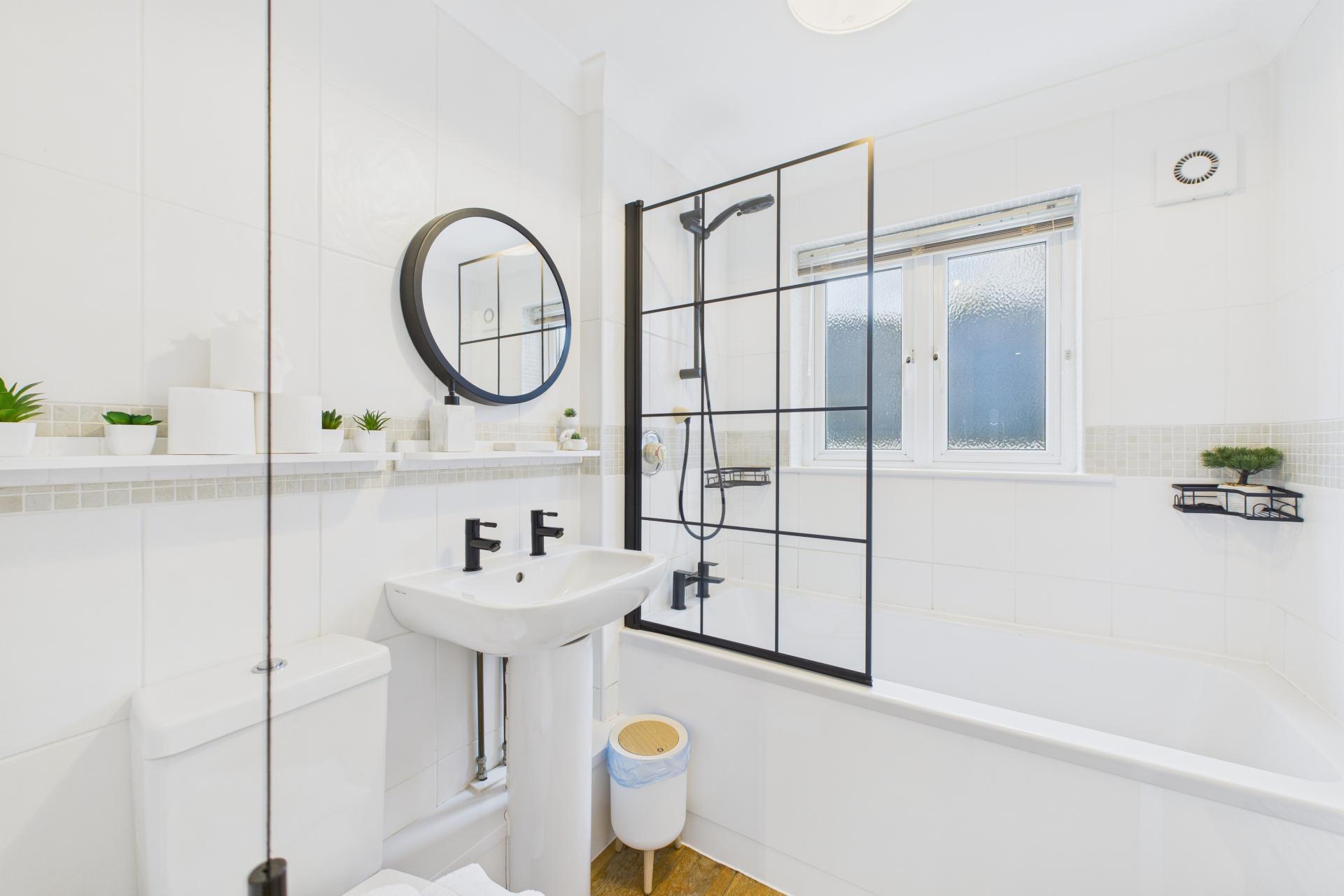 Upgraded bathroom having opaque UPVC double glazed window to the side, oak flooring, panelled bath with mains connected shower over and glazed shower screen, pedestal wash hand basin, close coupled WC, tiled walls, large heated towel rail
