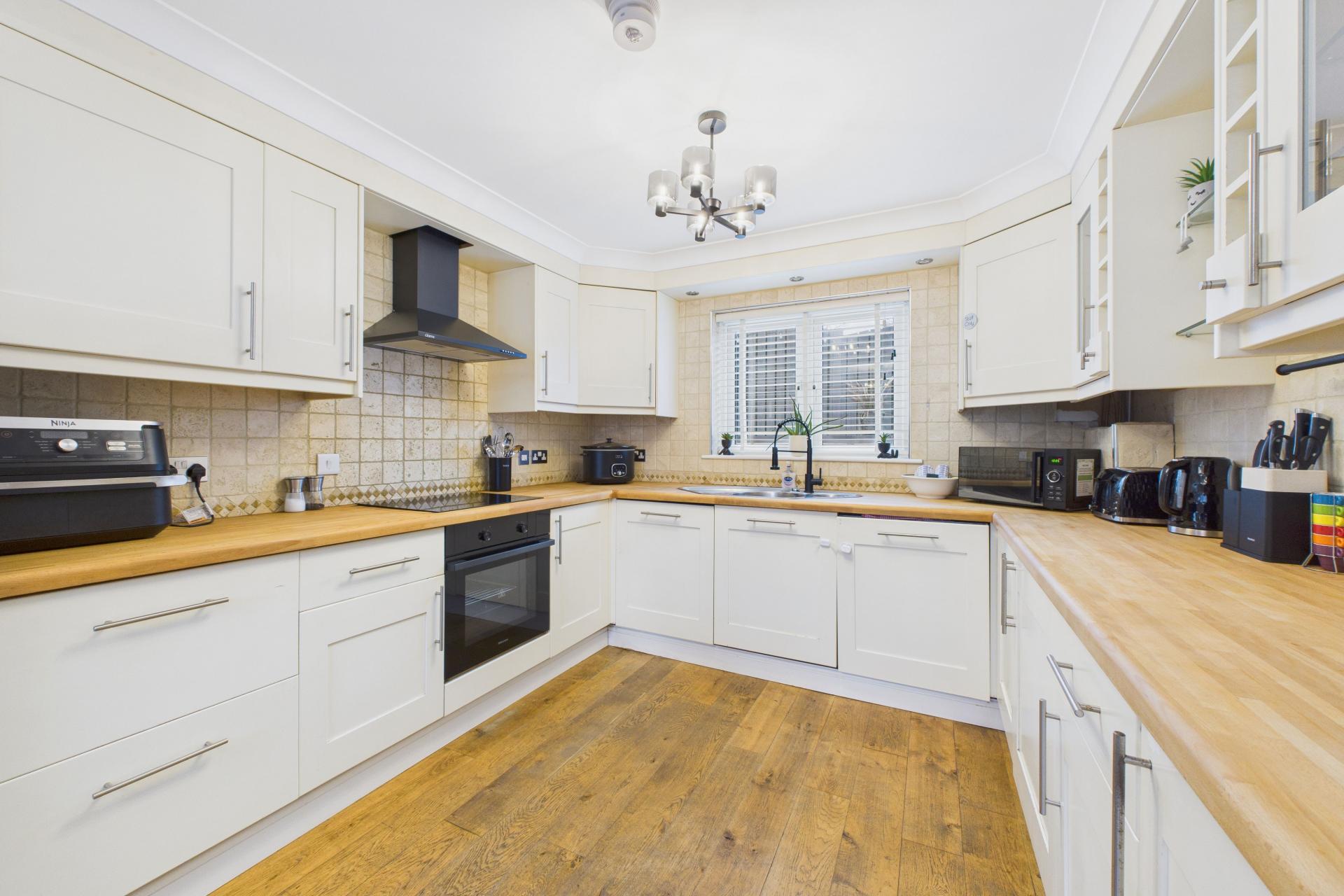 Great sized and very practical room with UPVC, oak flooring, double glazed window to the side elevation with further UPVC double glazed patio doors opening out to the rear courtyard, radiator, power points. Kitchen comprises a UPVC double glazed window to the side elevation, range of eye and base level units with oak worktop surfaces, integrated 4 ring electric hob with electric oven under and stainless steel hob and extractor over, one and half stainless steel sink unit and drainer with taps over, integrated dishwasher, space for fridge / freezer, integrated washing machine, ample power points