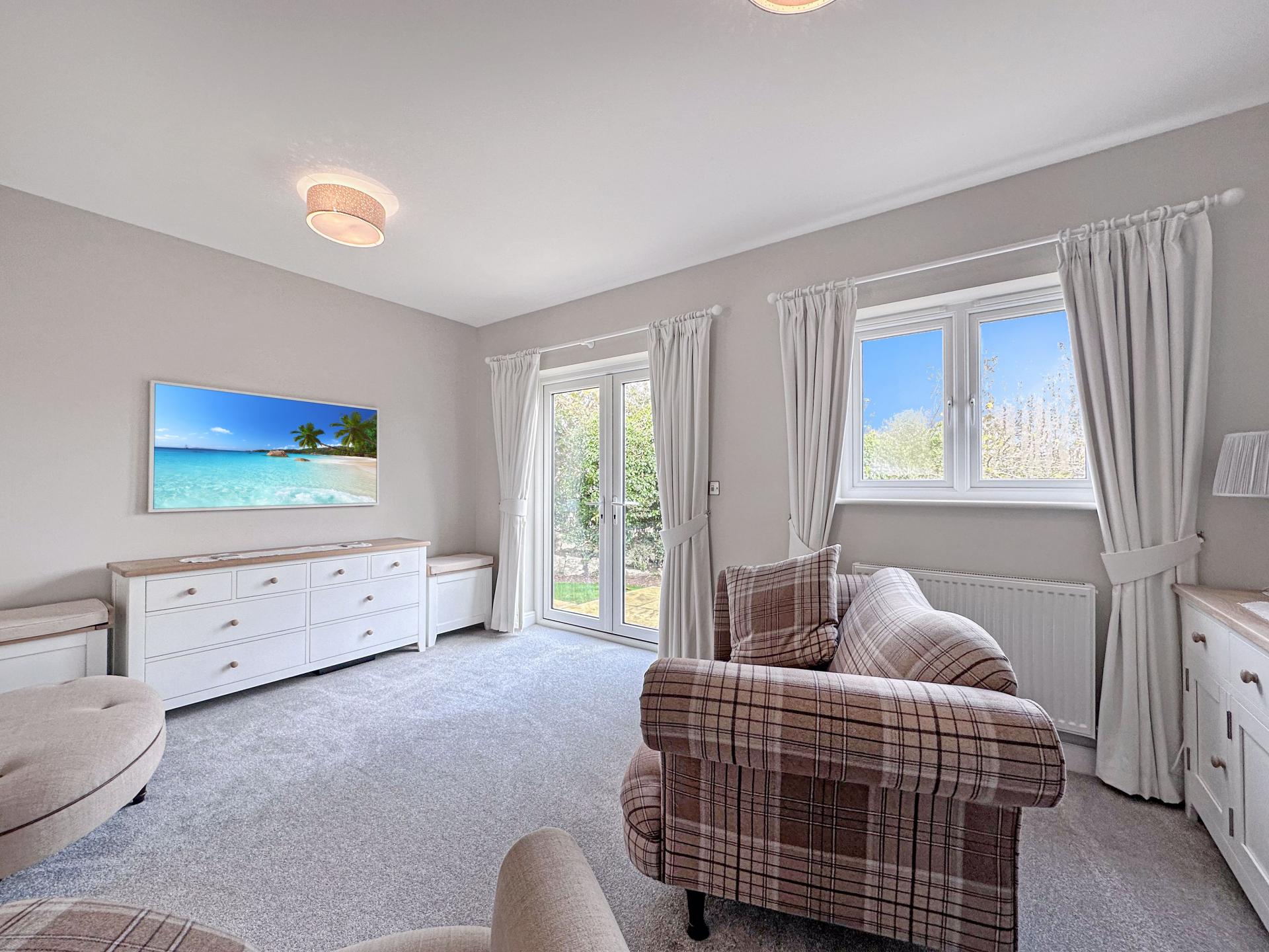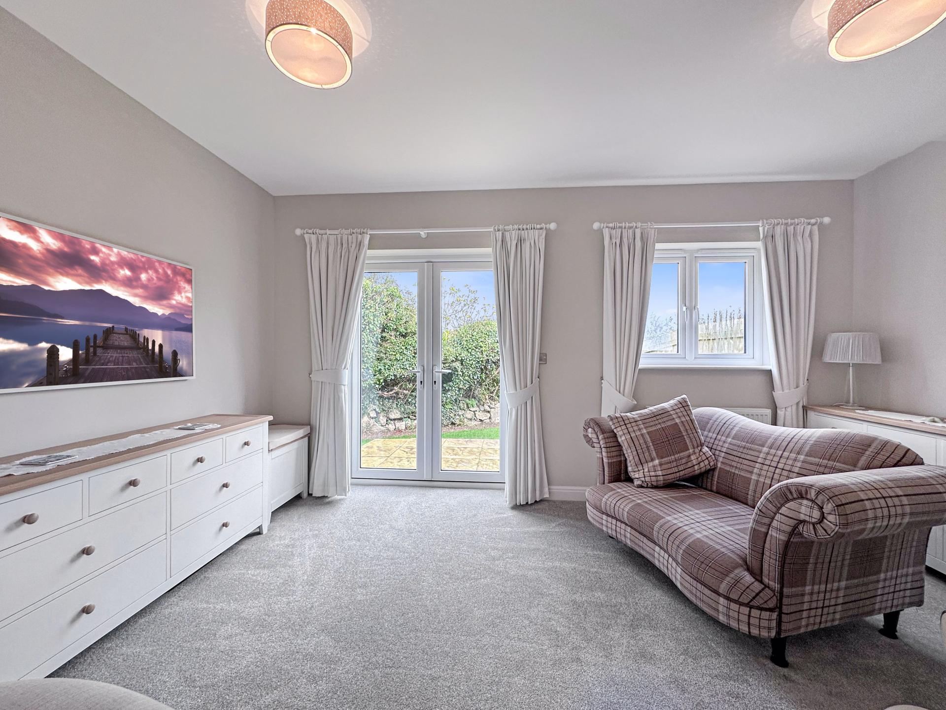 Another beautiful room with double glazed window and French doors opening out to the rear patio and garden. Carpeted, TV point for wall mounted TV, ample power points, radiator