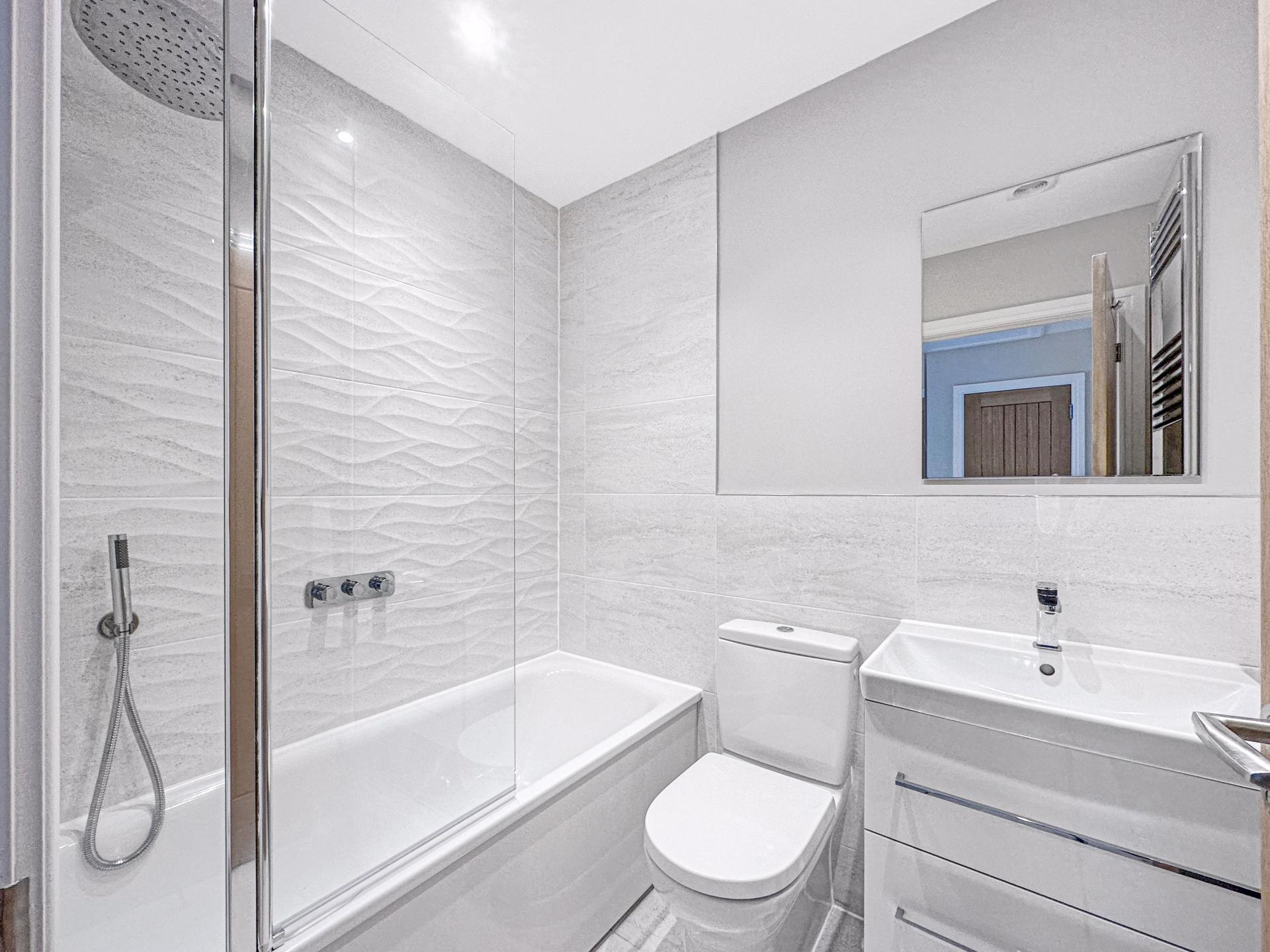 Fully tiled floor and walls, panelled bath with mains connected shower over offering rainfall head and detachable handheld, Villeroy and Boch ceramic wall hung sink unit with storge under, close coupled WC, fitted wall mirror, extractor fan