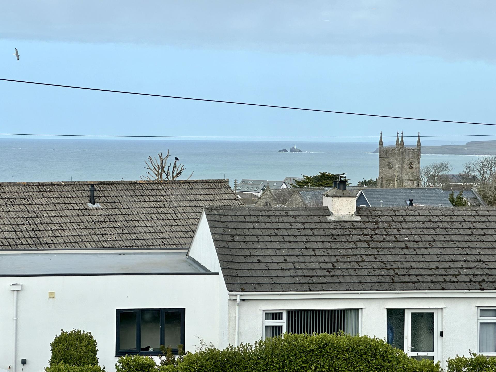 A great room, light and bright and offering fine sea and coastal views from the 2 windows to the front up to Godrevy Lighthouse and the surrounding coastline over to St Ives Harbour. Engineered hardwood flooring, ample power points, vertical radiator, contemporary Scandinavian Rais Viva 100L log burner in the corner, beamed ceiling, inset ceiling lights, TV points