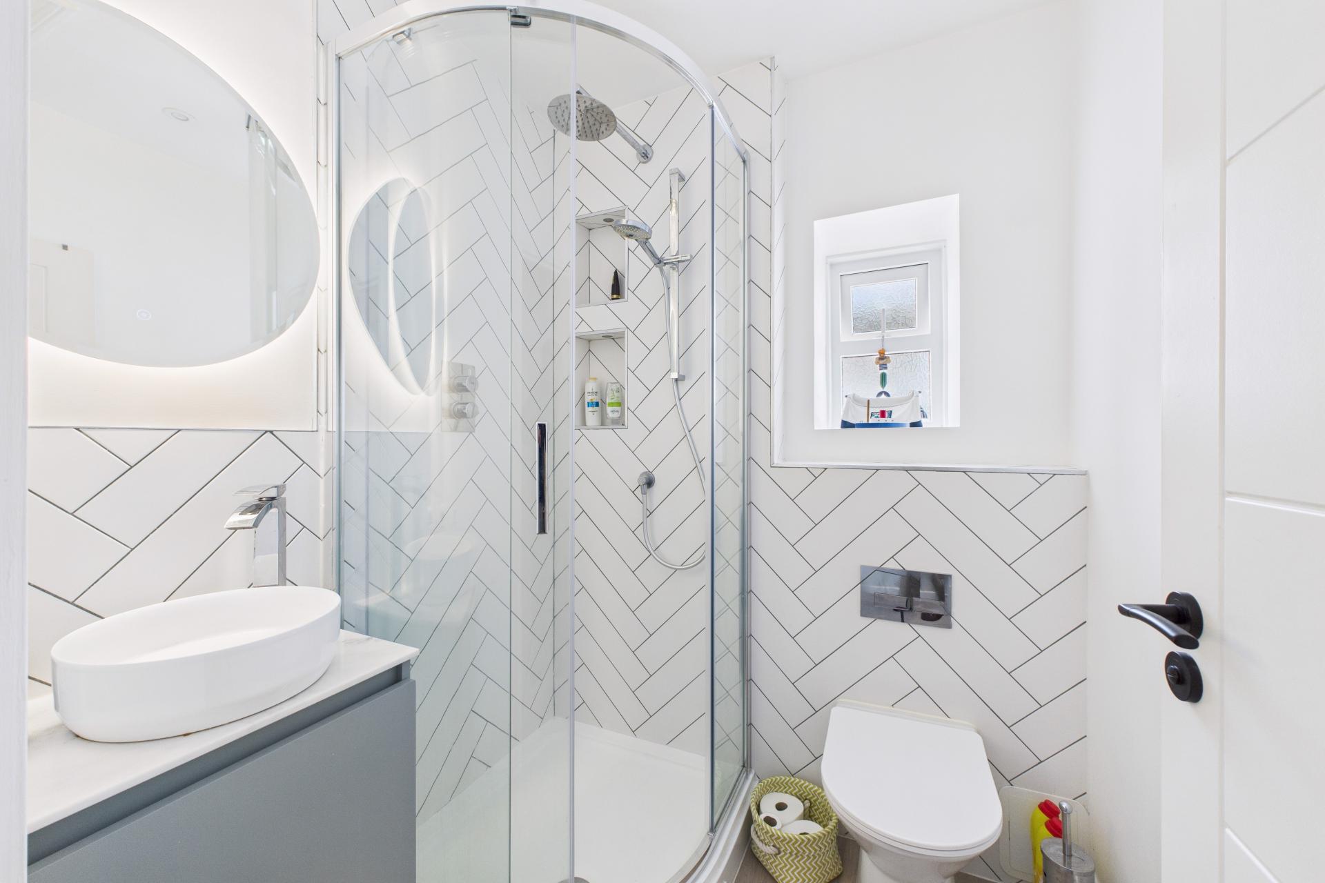 Super shower room with a large walk in shower cubicle having mains fed shower with rainfall and detachable head, circular sink unit with storage under, enclosed WC, frosted window to the side, part tiled walls, underfloor heating