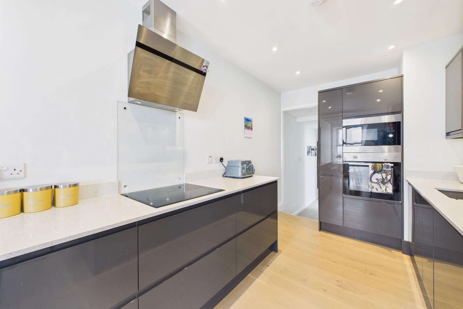 Lovely modern kitchen having and extensive range of eye and base level units with ample granite worktop surfaces over. 4 ring AEG hob with extractor hood and fan over, eye level oven and microwave, integrated dishwasher, integrated fridge/freezer, integrated washer / dryer. sink unit inset the worktop surface with routed drainer, engineered hardwood floor, ample power points