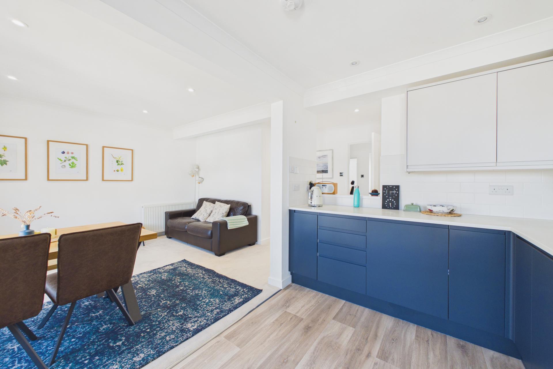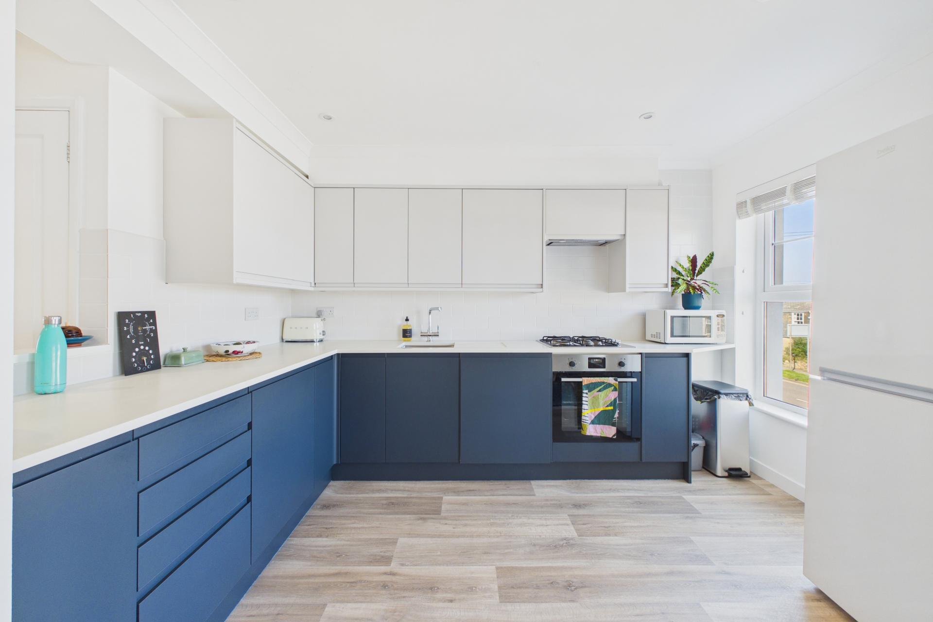 The kitchen has been recently upgraded with modern fitted units in blue and white to provide ample eye and base level cupboard space with super worktop space over and under unit lighting. Integrated 4 ring gas hob with electric oven under and extractor fan over, inset stainless steel sink unit with routed drainer and mixer taps over, integrated dishwasher and washing machine, space for fridge freezer, ample power points, window to the front with sea glimpses.
