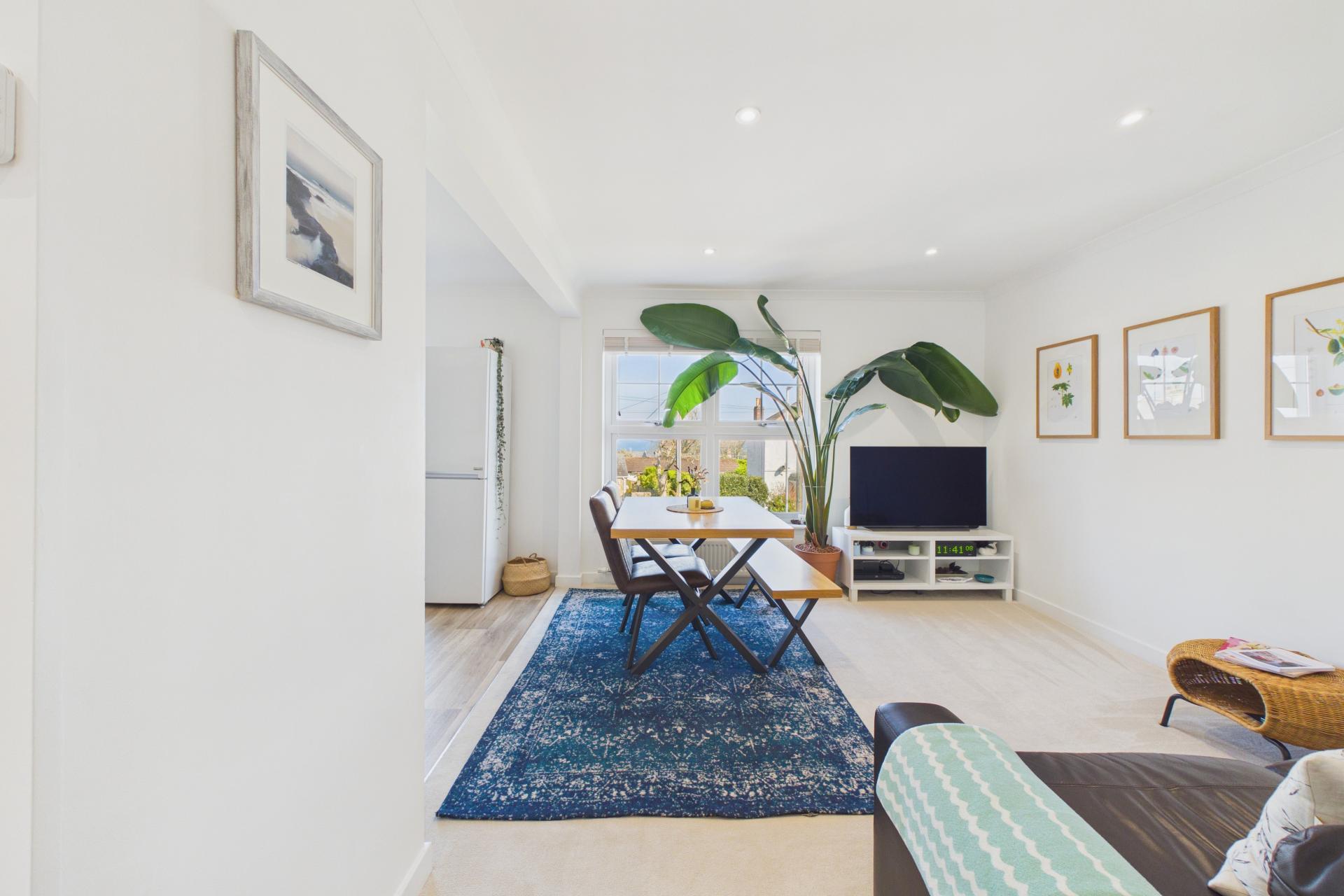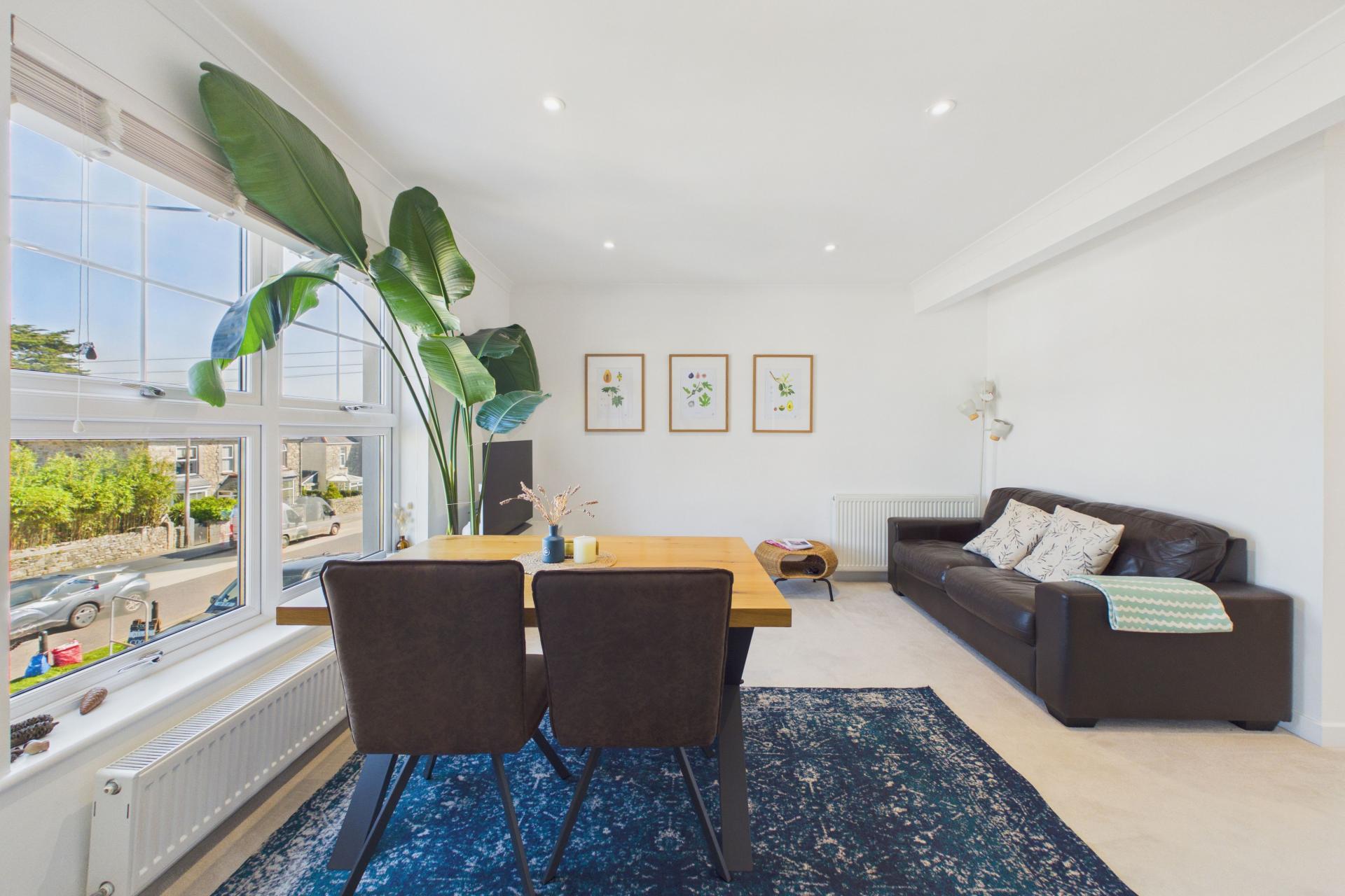 Super room, again offering bright and light accommodation. offering lounge, dining area and kitchen. With two windows to the front offering a glimpse of the sea. The lounge area is carpeted with radiator, power points and TV point with inset ceiling lights.
