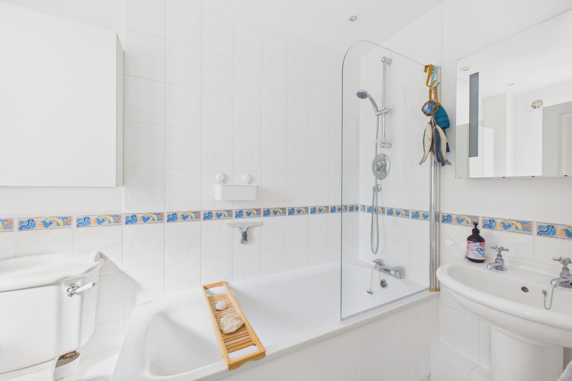 Well appointed bathroom with pedestal wash hand basin, stainless steel heated towel rail, close couple WC, panelled bath with mains connected shower over and glazed shower screen, part tiled walls, opaque double glazed window to the rear
