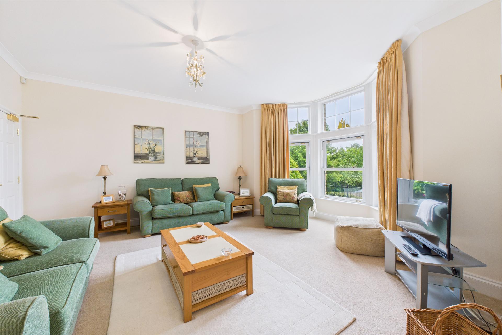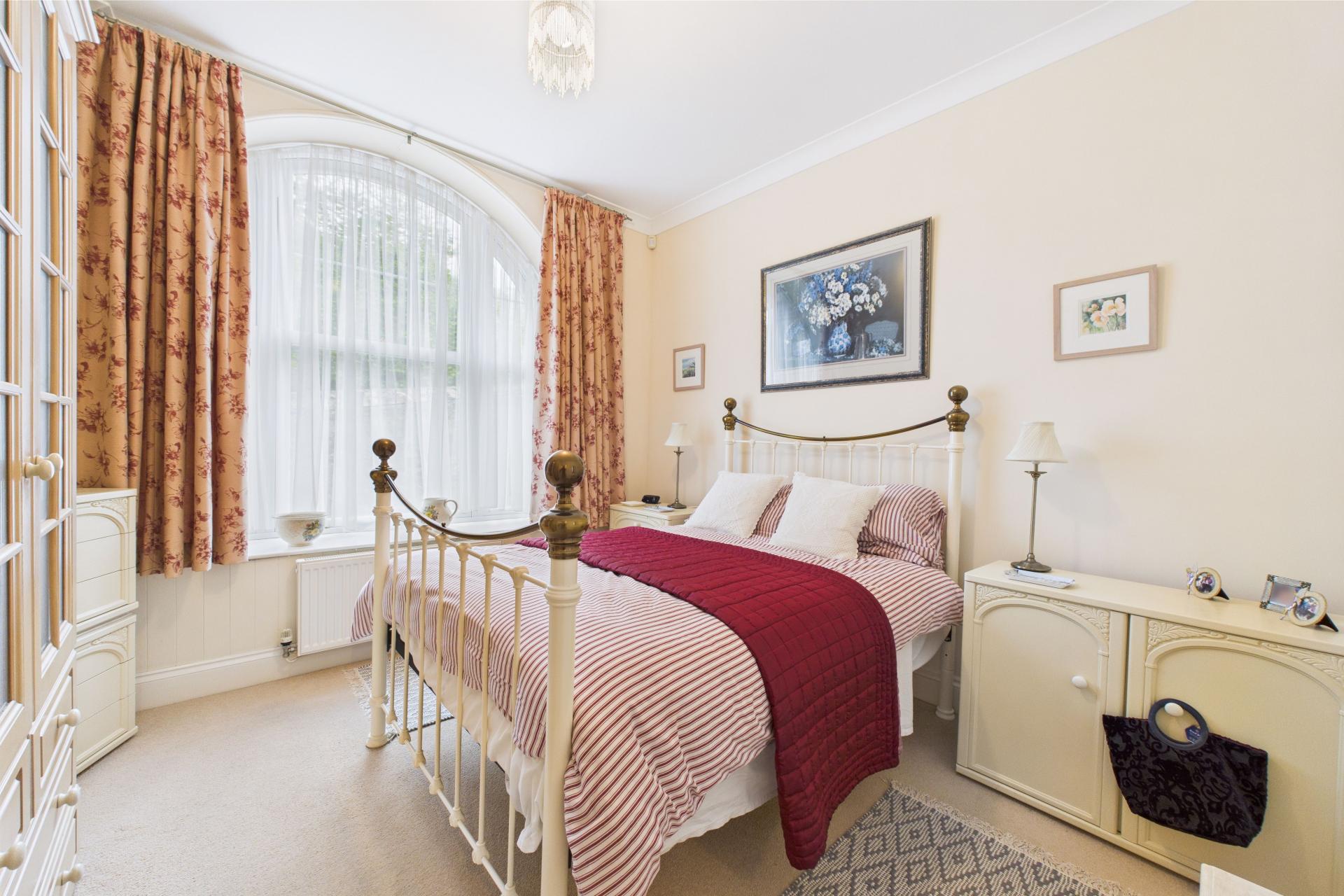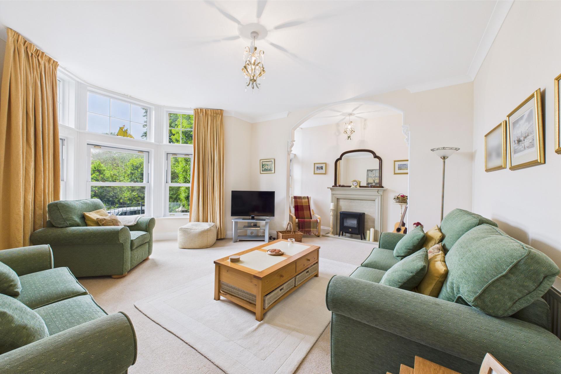 Beautiful light and airy room having UPVC double glazed bay window to the front with further UPVC single window to the front, both overlooking the private terrace and out to the communal gardens, ample power points, radiator, decorative arch into a small further area of the room with moulded fireplace and tiled hearth with a further small radiator