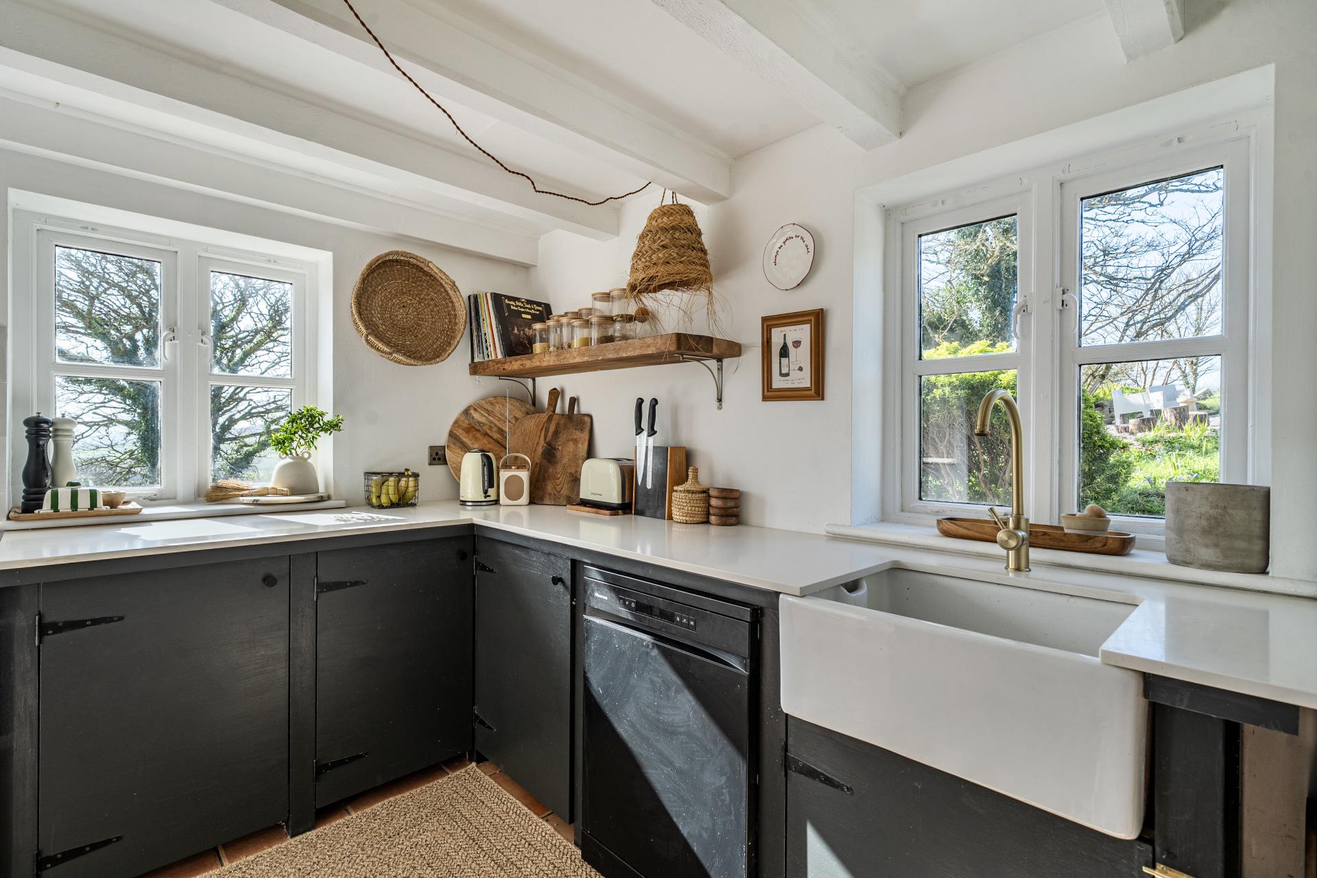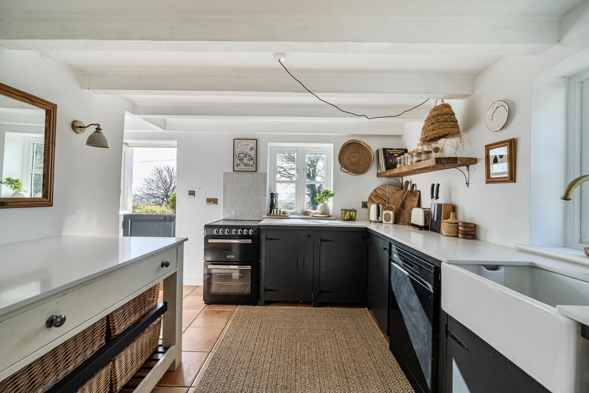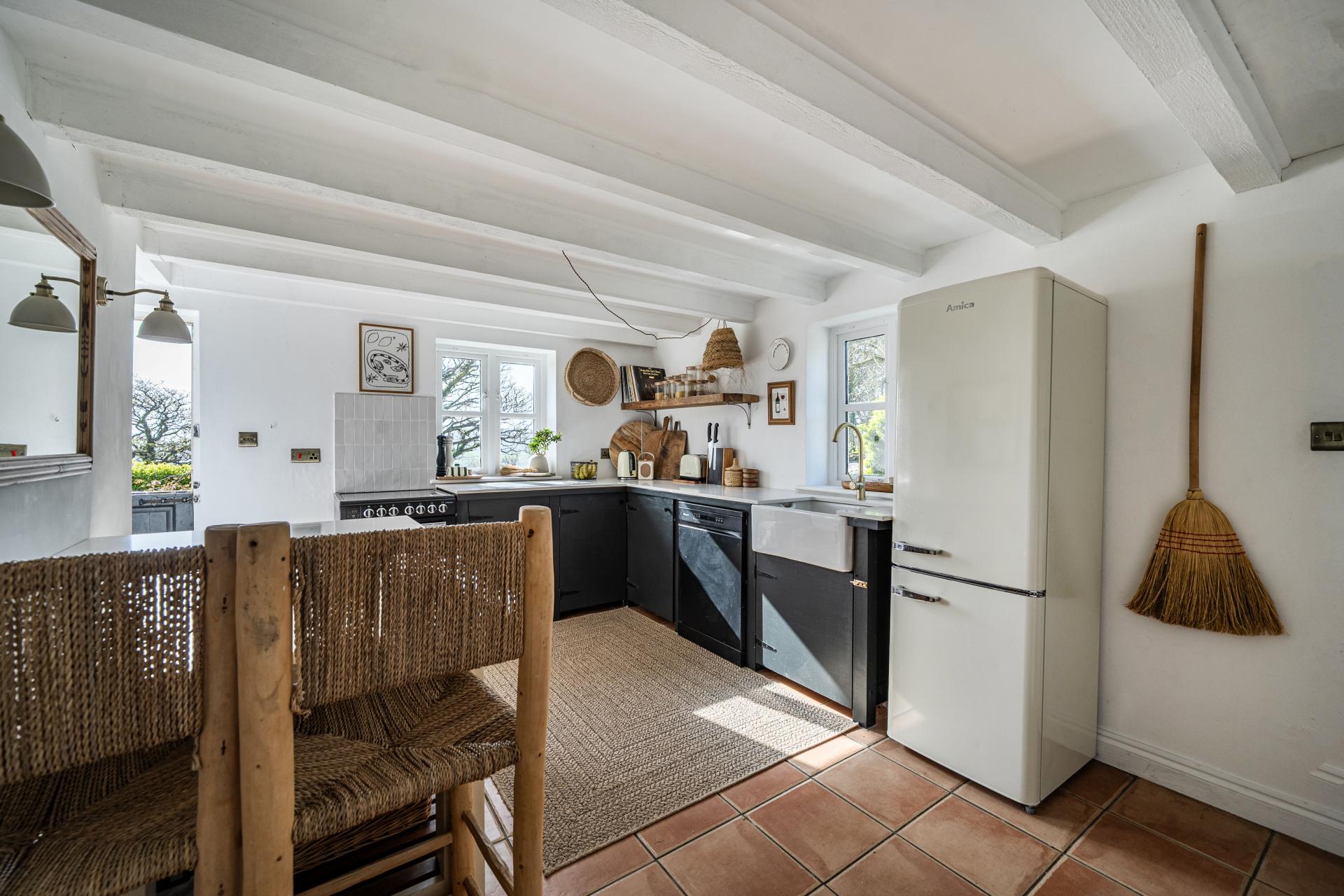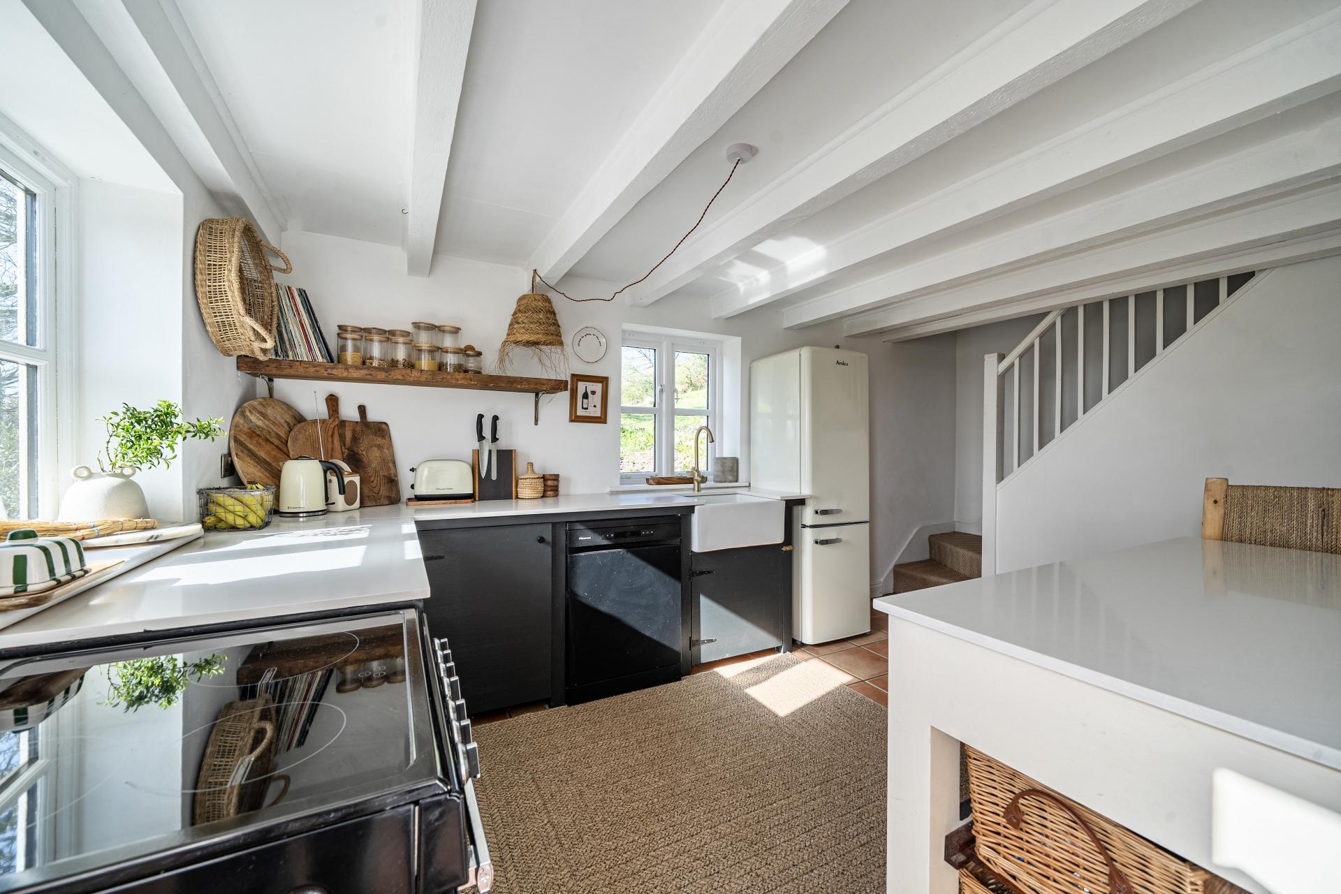 Accessed via a stable door to the front, the kitchen offers ample base level units with worktops over, super bright and light room, unusual for a cottage, stairs rise to the first floor, with a door opening out to the lounge and door into the dining room