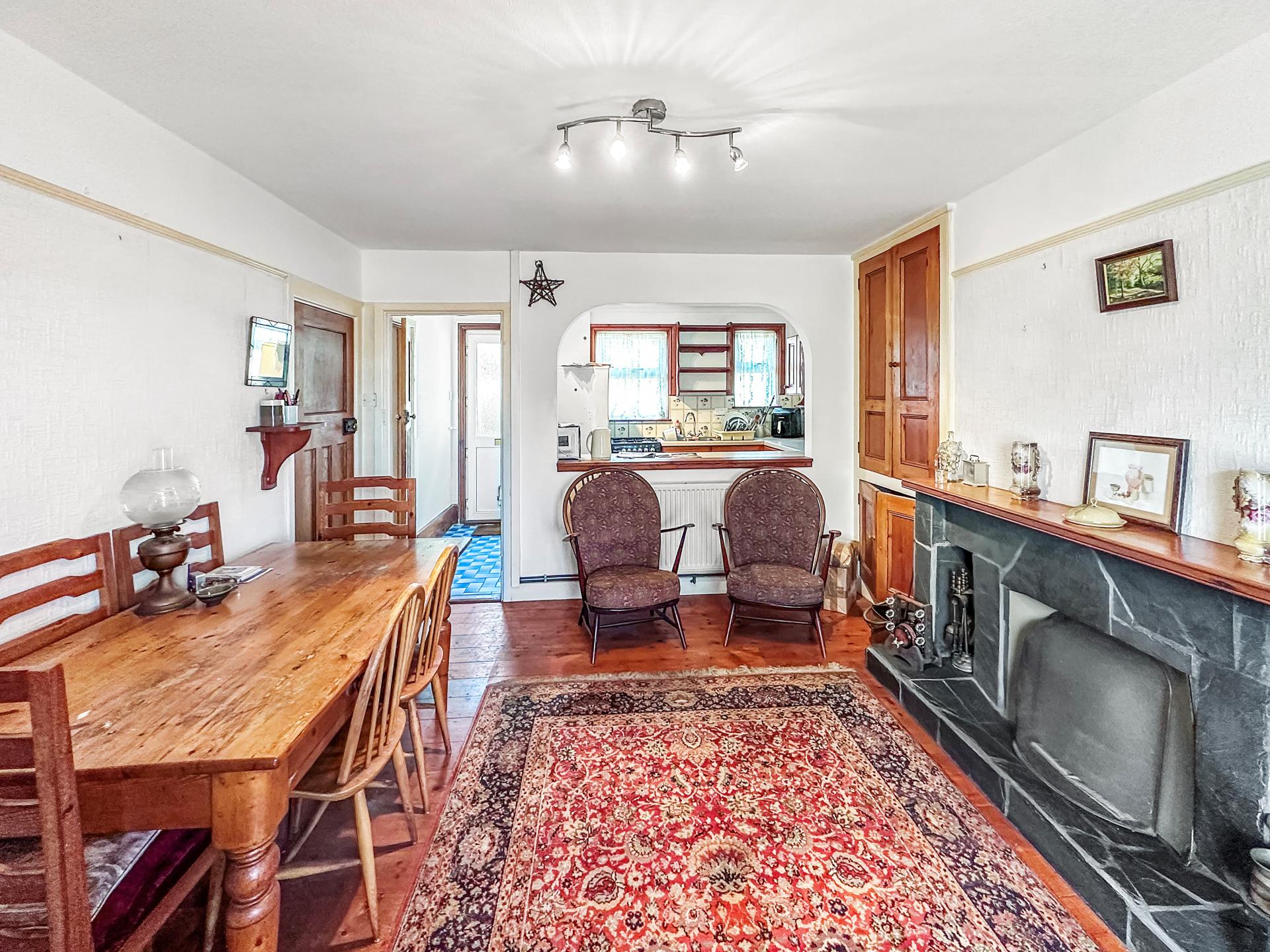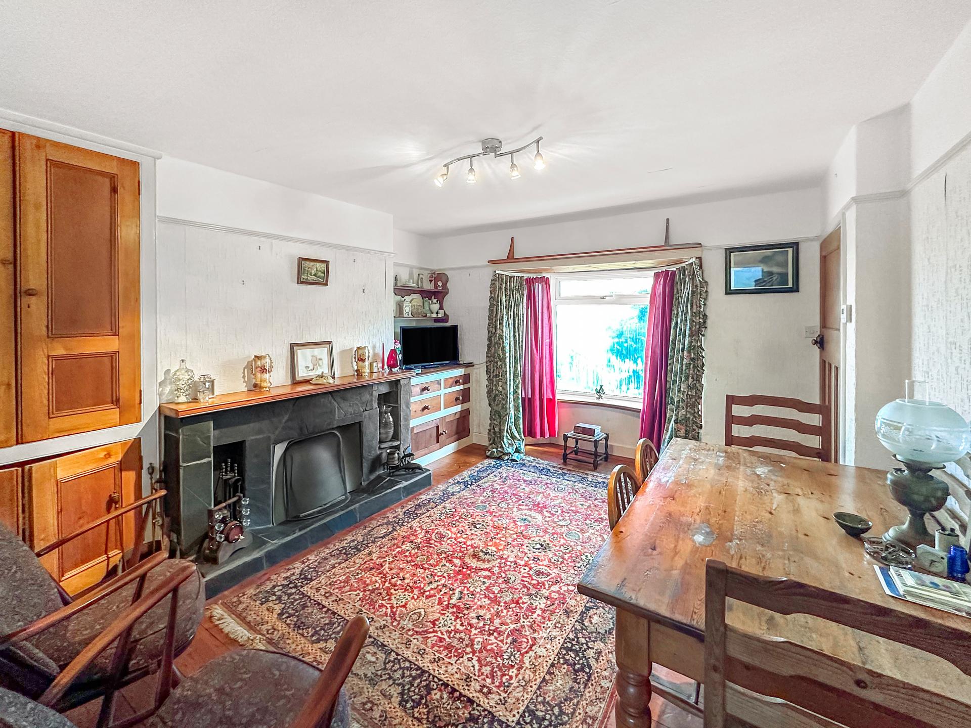 UPVC double glazed bay window to the rear overlooking the garden and views down over to the sea, wood floorboards, recess cupboard space, open fire with slate hearth and surround, TV points, cupboard under stairs, power points, door to hallway and first floor