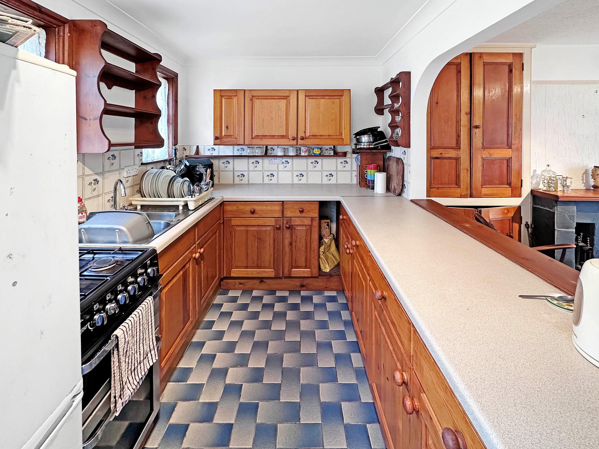Having a range of fitted base and eye level units with worktop space over, stainless steel one and a quarter sink unit and drainer, space for gas cooker, two UPVC double glazed window to the front, space for fridge freezer, power points, complimentary tiling, arch through into living room and door to inner hallway through to extension