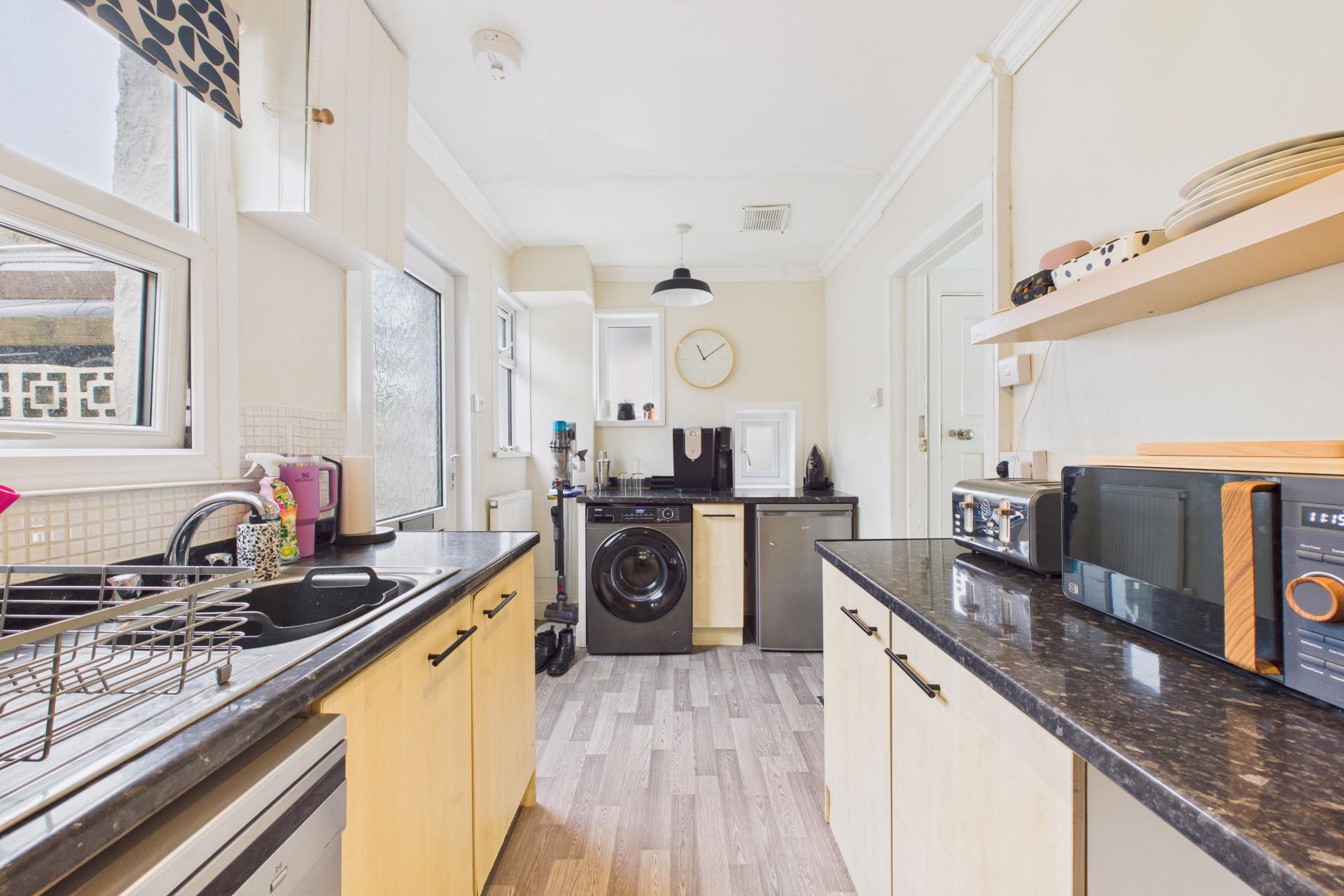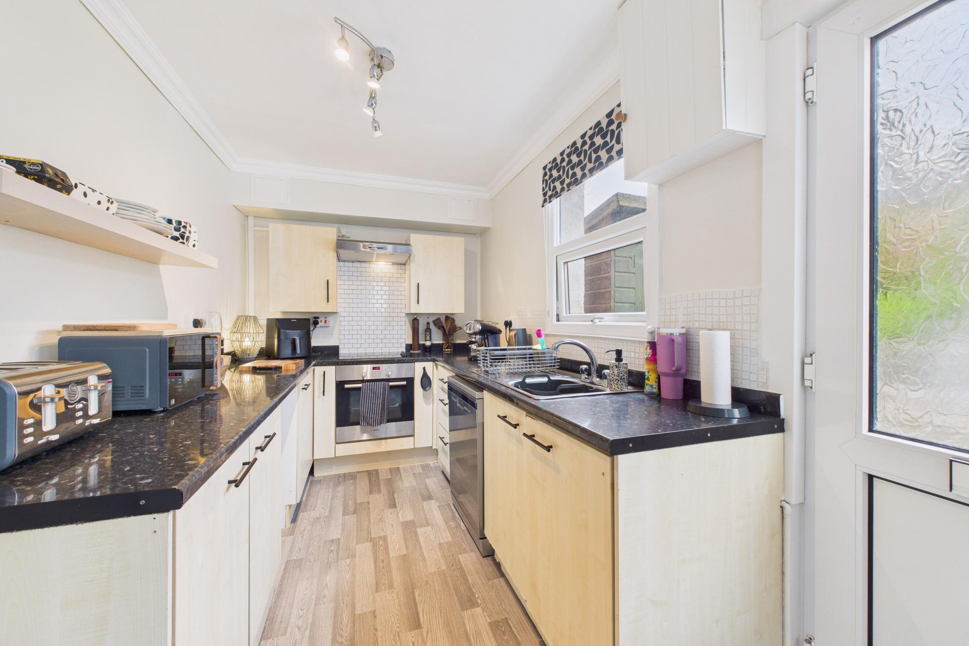 Good size kitchen with an extensive range of eye and base level units and ample worktop surfaces over. Stainless steel sink unit and drainer with taps over, 4 ring electric hob with electric oven under with stainless steel hood and fan over, plumbing for dishwasher and plumbing for washing machine, with space also for under counter fridge, radiator, power points, UPVC double glazed window to the front and small UPVC double glazed window to the side, door to