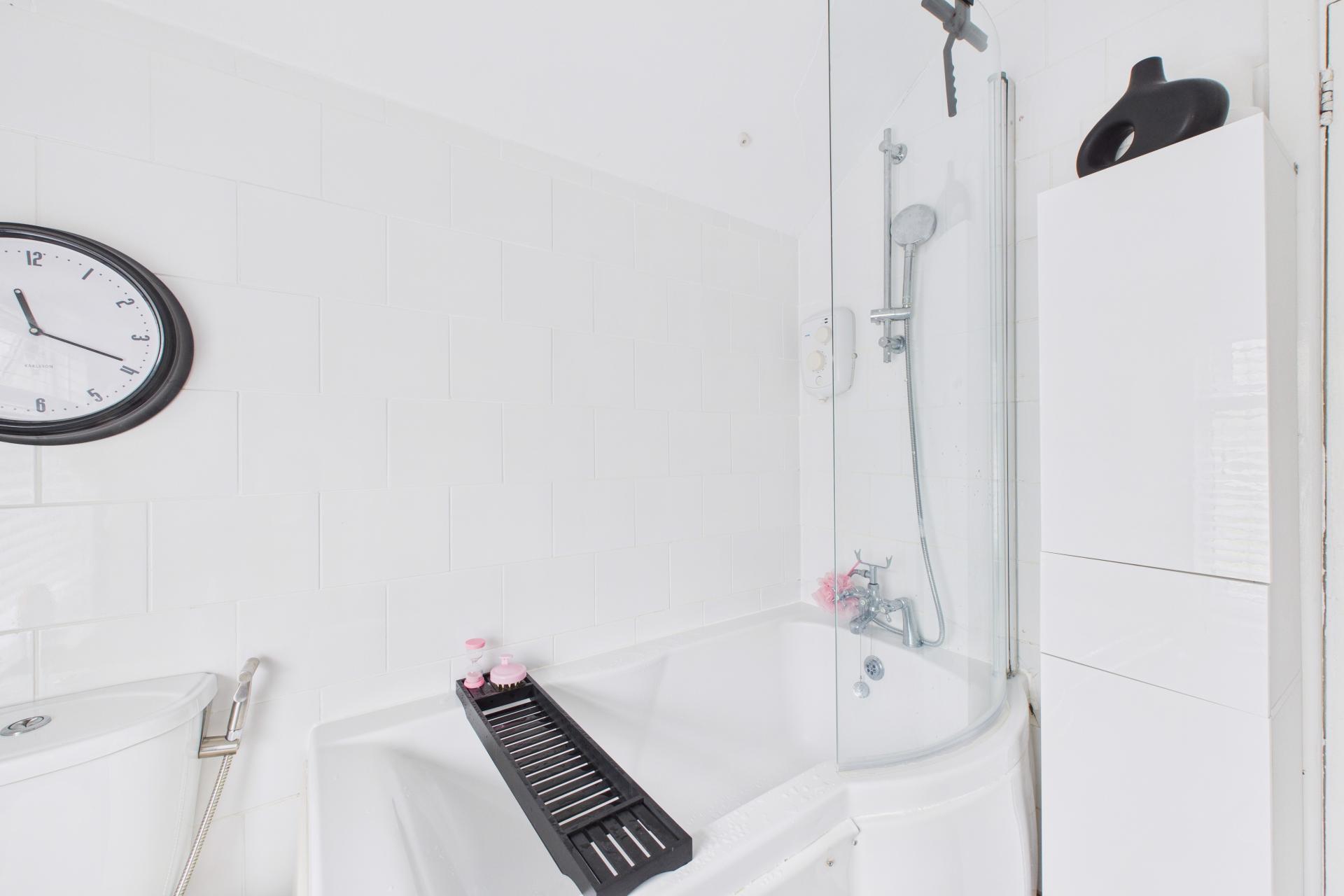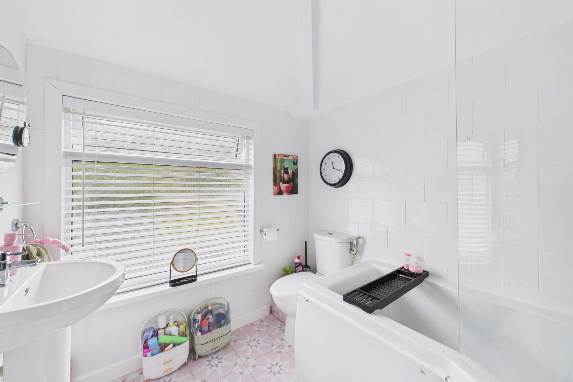 UPVC double glazed patterned window to the rear, pedestal wash hand basin, close coupled WC, panelled bath with shower attachment over and shower screen, stainless steel heated towel rail, tiled walls,