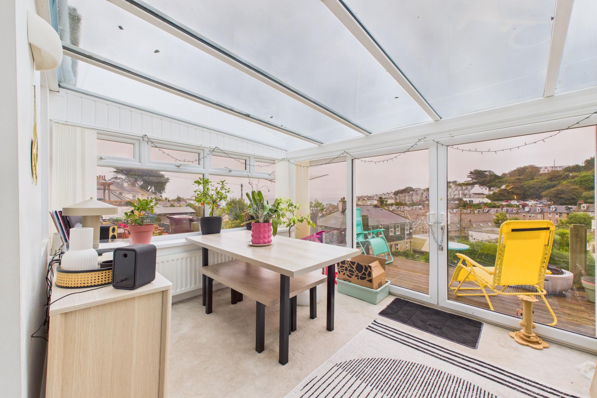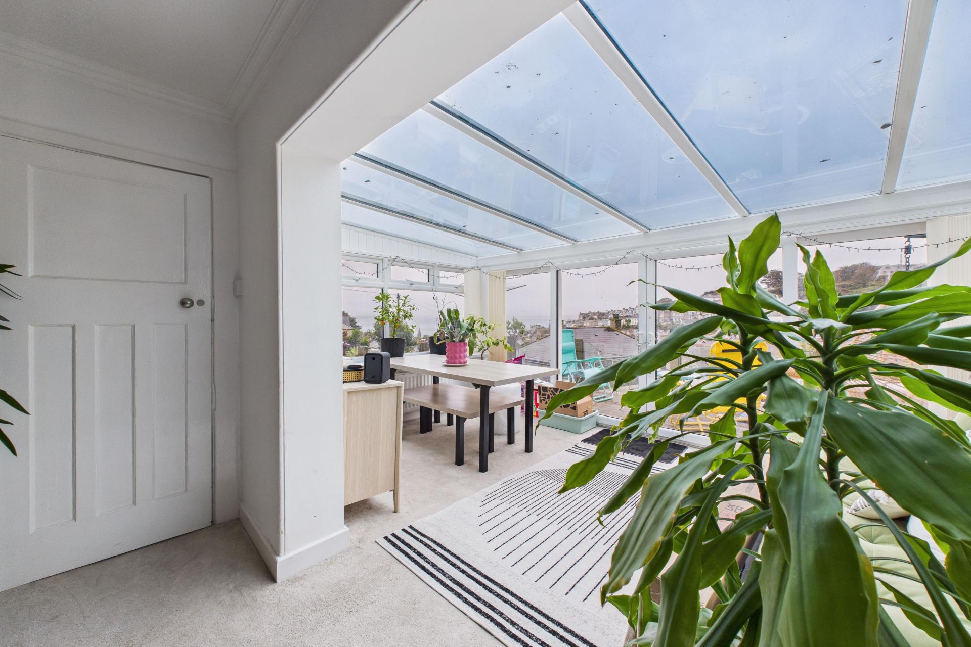 Offering fine sea and coastal views with glazed roof and glazing to two sides with sliding doors and glazing opening out onto the large balcony, radiator, power points, window into inner hallway